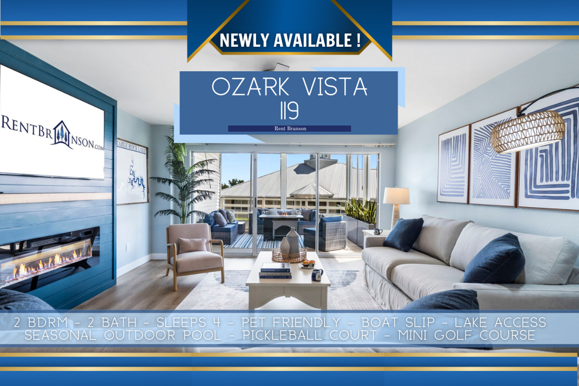 <strong>Ozark Vista 119</strong> at Ozark Mountain Resort features two comfortable bedrooms with ensuite bathrooms, resort amenities and lake access. Unwind on the patio and enjoy the fresh air by the firepit table or snuggle up watching your favorite movies by the fireplace. Set the stage for the perfect movie marathon with some tasty snacks made in the fully equipped kitchen. Don't miss the ultimate relaxing getaway—make unforgettable memories surrounded by the stunning beauty of the Ozarks. Guests receive $400 in attraction tickets with every booking—it’s our way of saying thanks.<br />