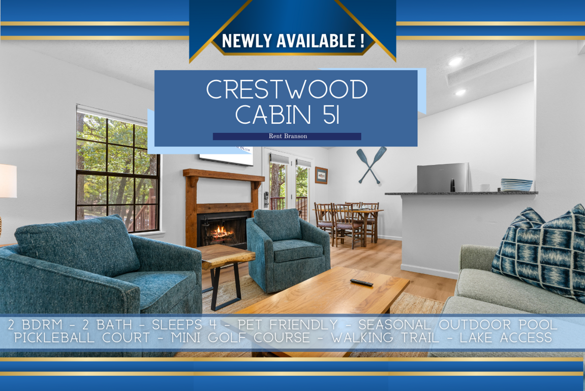 <strong>Crestwood Cabin #51</strong> welcomes you to this warm and inviting 2-bedroom, 2-bathroom bungalow that feels like home. Step into the spacious private deck perfect for relaxing outdoor meals or morning coffee among the trees. The natural backdrop of the trees enhances the peaceful, rustic charm, a perfect setting for a quiet retreat or memorable moments with family and friends. Whip up a tasty meal in the completely renovated, fully equipped kitchen, or bring the family together in the cozy living room for an unforgettable movie night by the wood-burning fireplace. Enjoy this perfect getaway with exclusive access to serene waters. Don't wait any longer, book your stay today! $400 in attraction tickets come standard with every confirmed stay.<br />