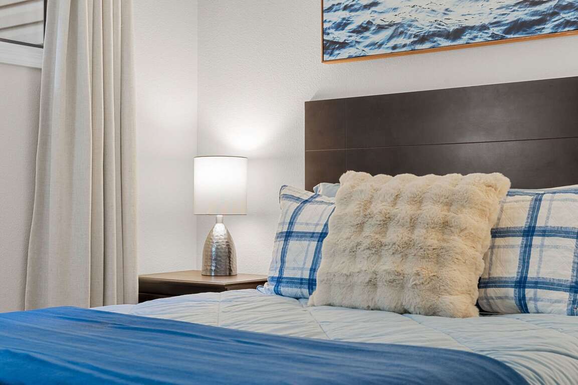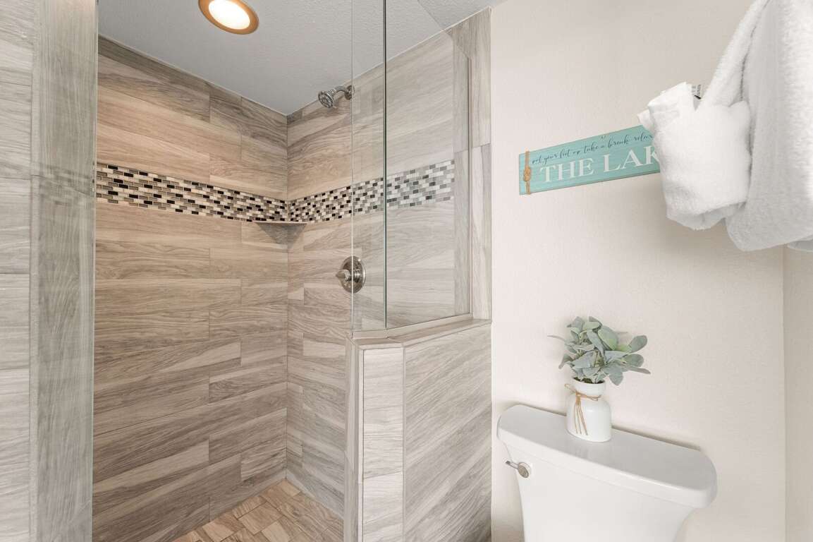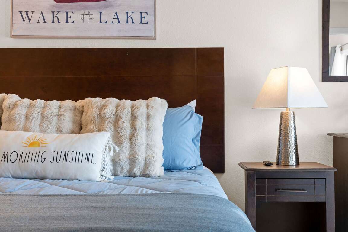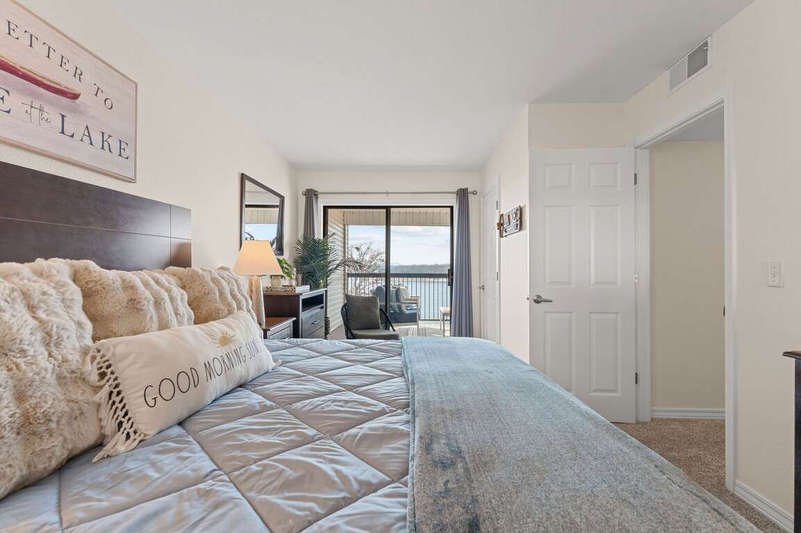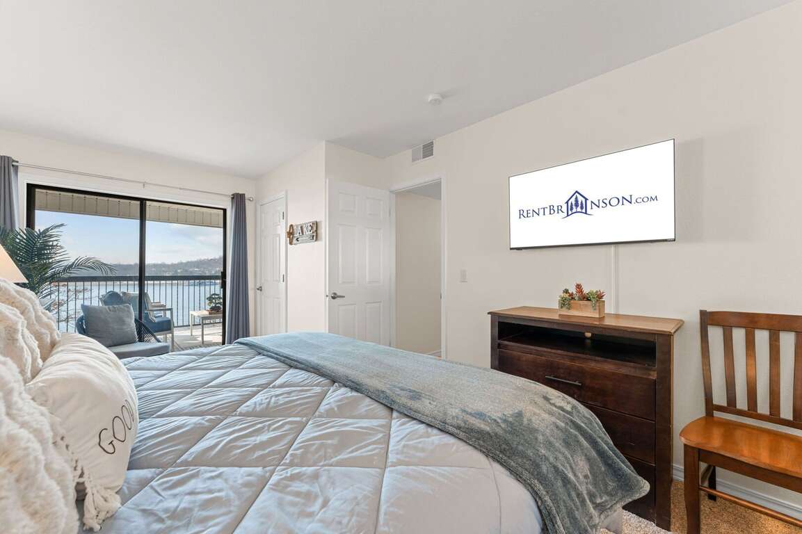 Bedroom 1: King Ensuite with a shower; Private Deck Access w Seating & Lake View, TV<br />