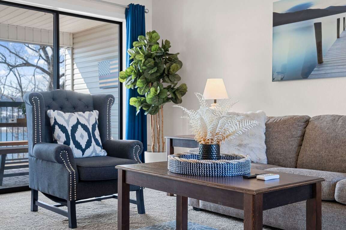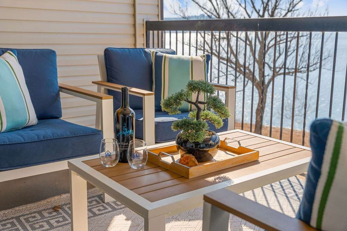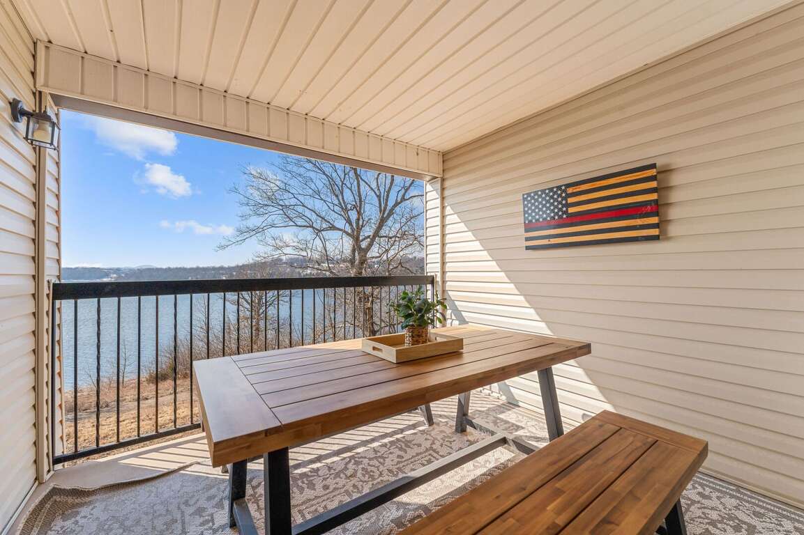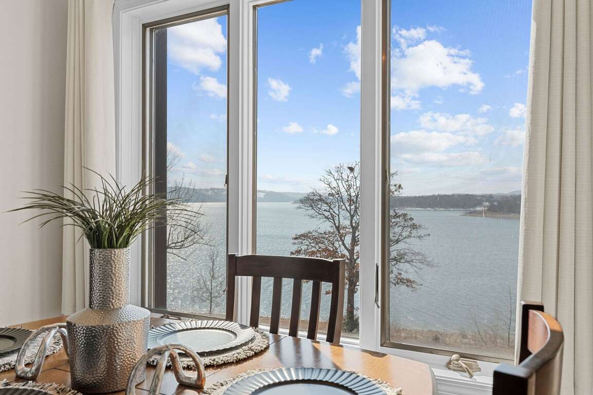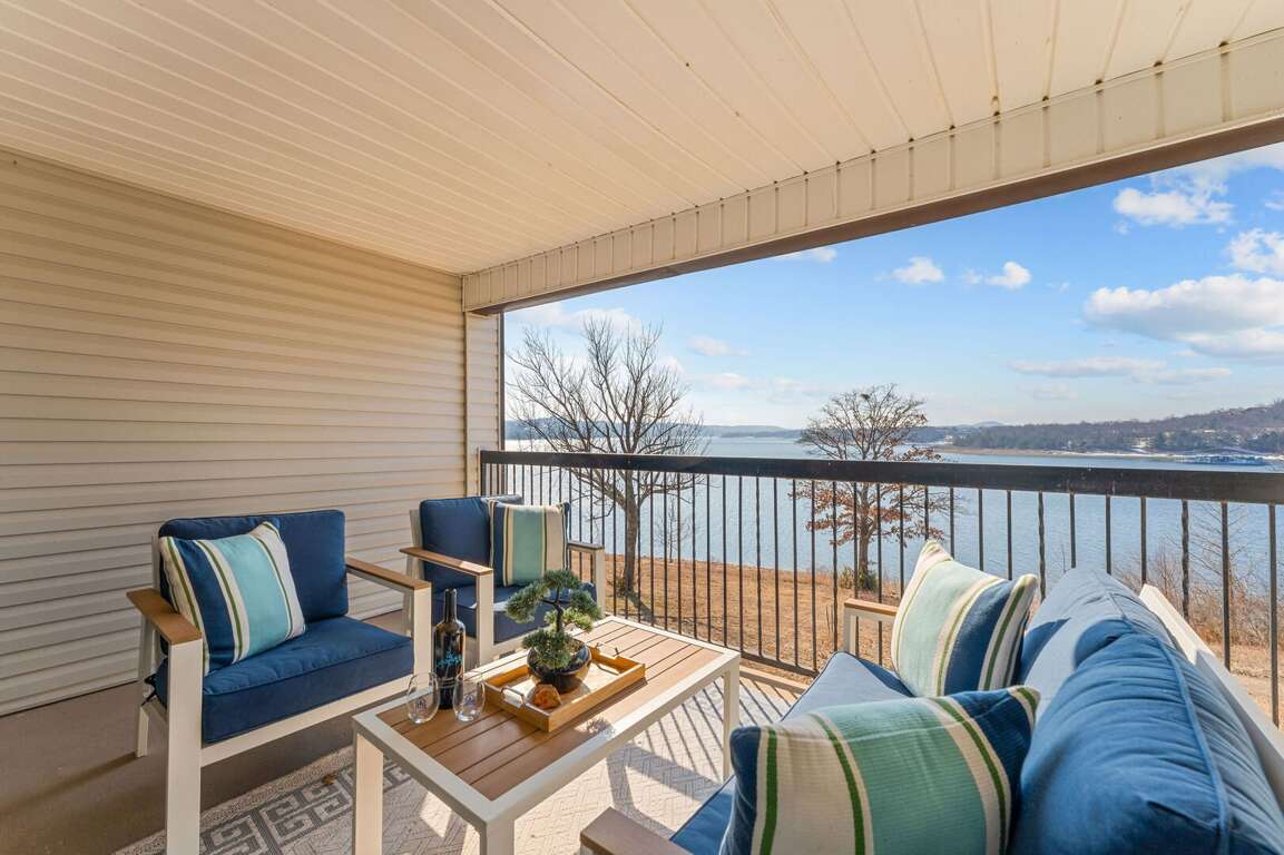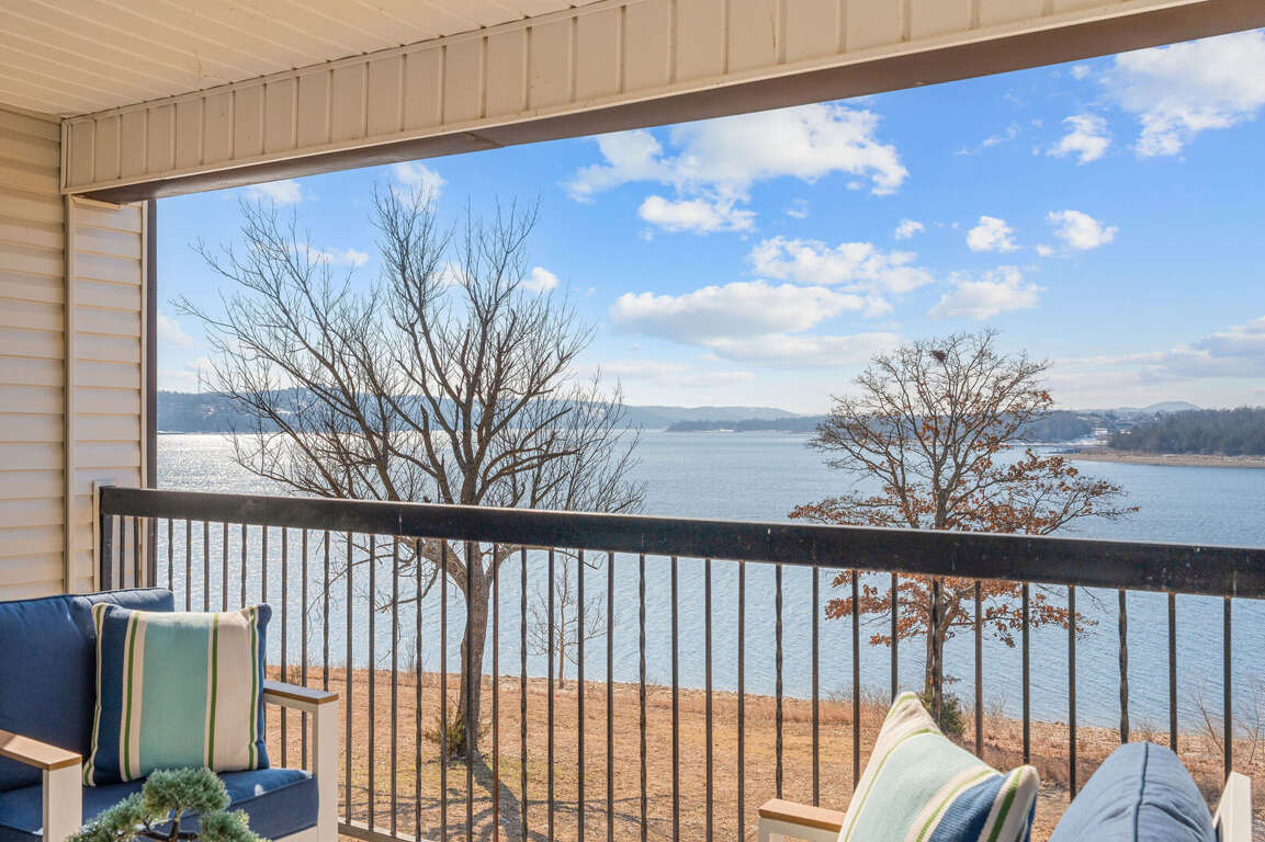 Inside, you will find a cozy living area with a fireplace, perfect for relaxing nights in. The fully-equipped kitchen is ideal for creating delicious dishes that you can enjoy in the dining area, with the most beautiful view of Table Rock Lake. Pour yourself a cup of coffee or a glass of wine, then take it onto the patio to soak in the sun's reflection on Table Rock Lake. When you are ready for a restful night's sleep, head into either of the two bedrooms. One of which is a master king bedroom with a vanity, an ensuite bathroom, and a private deck with seating and a front row view of the lake.<br />