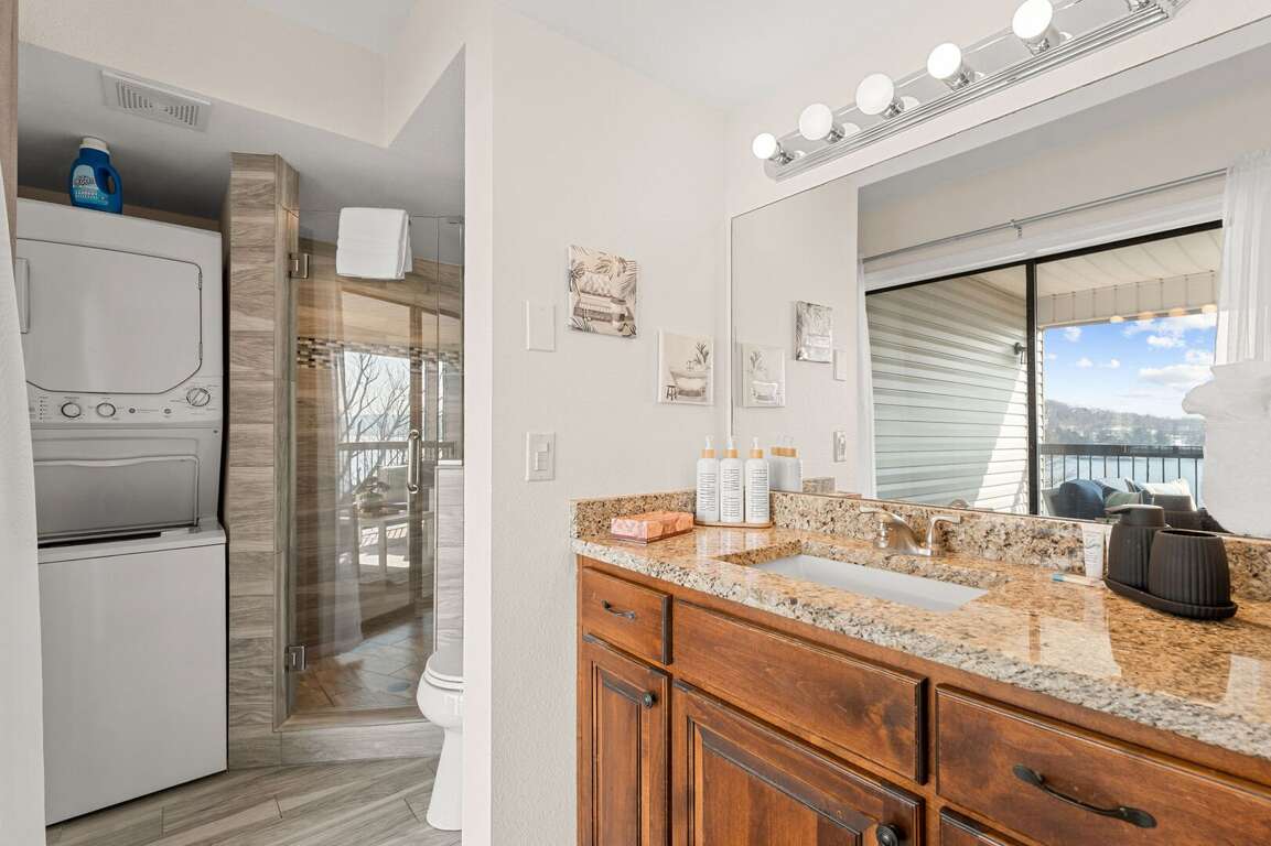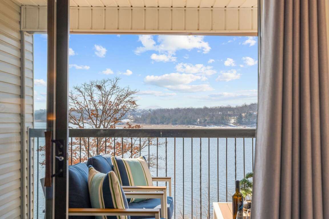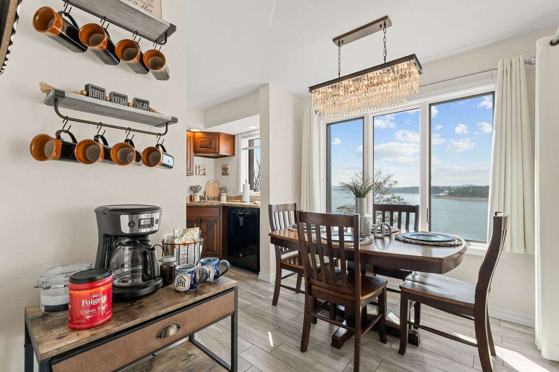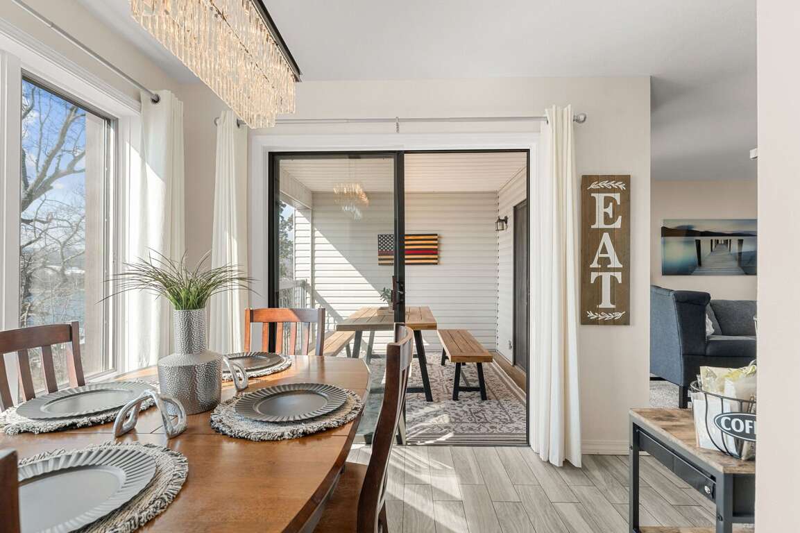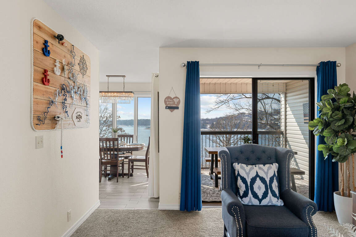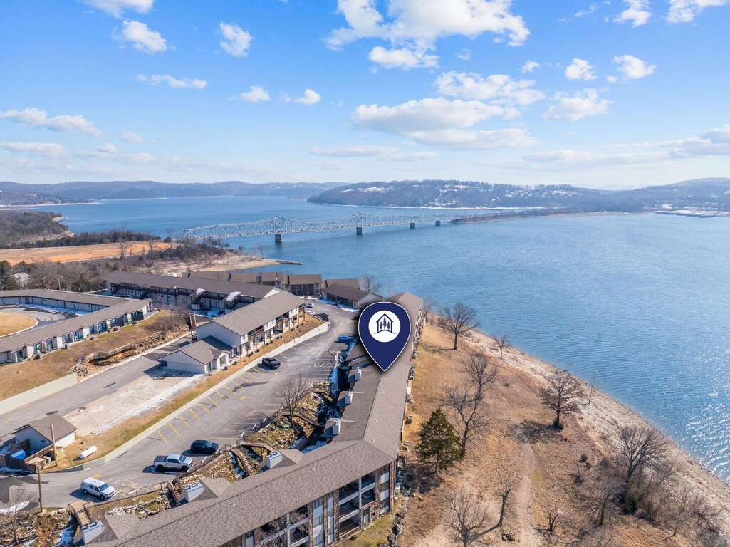 Inside, you will find a cozy living area with a fireplace, perfect for relaxing nights in. The fully-equipped kitchen is ideal for creating delicious dishes that you can enjoy in the dining area, with the most beautiful view of Table Rock Lake. Pour yourself a cup of coffee or a glass of wine, then take it onto the patio to soak in the sun's reflection on Table Rock Lake. When you are ready for a restful night's sleep, head into either of the two bedrooms. One of which is a master king bedroom with a vanity, an ensuite bathroom, and a private deck with seating and a front row view of the lake.<br />