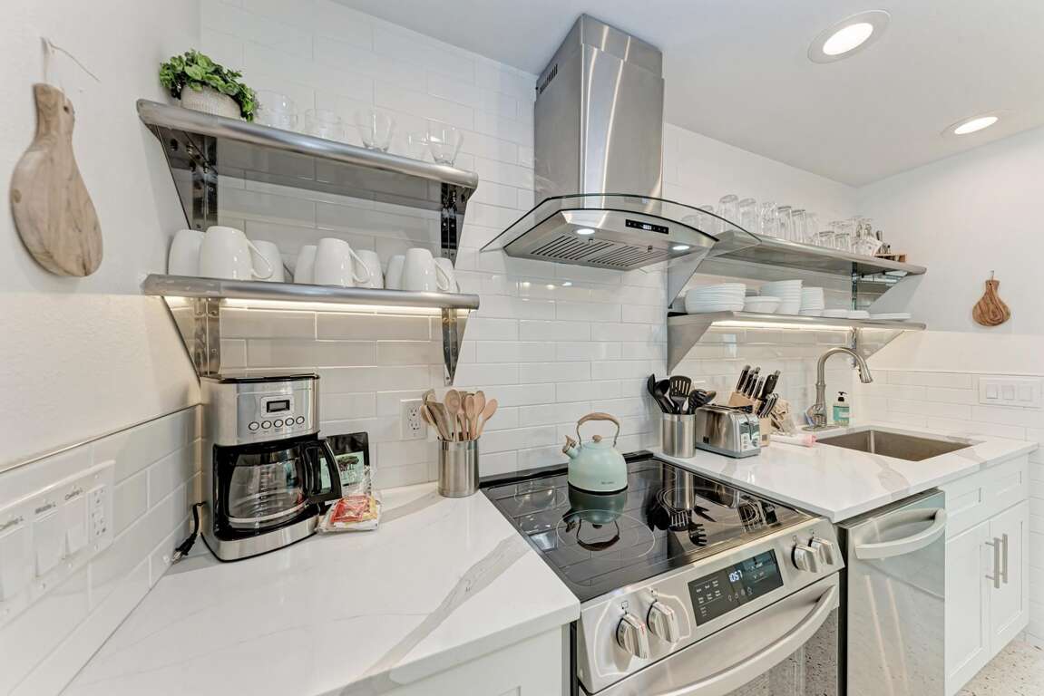 • The Main house offers a brand new kitchen with custom cabinetry, quartz countertops and stainless steel appliances.Â