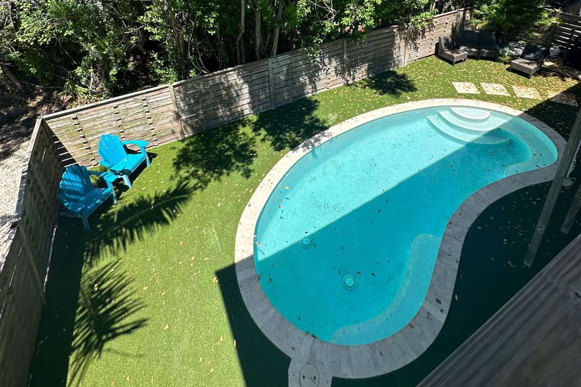 Paradise on Pine is an elevated home that sits above a quiet retail shop and offers a private backyard oasis complete with a heated pool, lush tropical landscaping, lounge seating, and a gas grill – your own serene escape after a day of sun and sand.