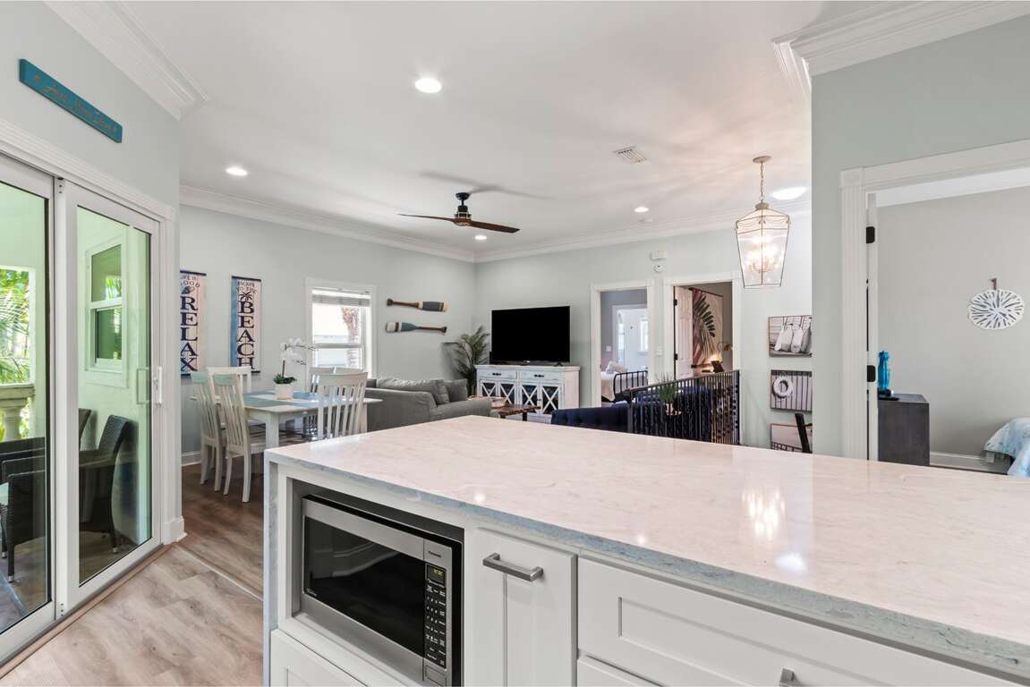 The bright living area is the ideal place to gather, whether you’re watching a favorite show on the flat-screen TV or unwinding with a book after a day in the sun. The fully equipped kitchen includes everything you need to prepare meals to enjoy indoors or outside.