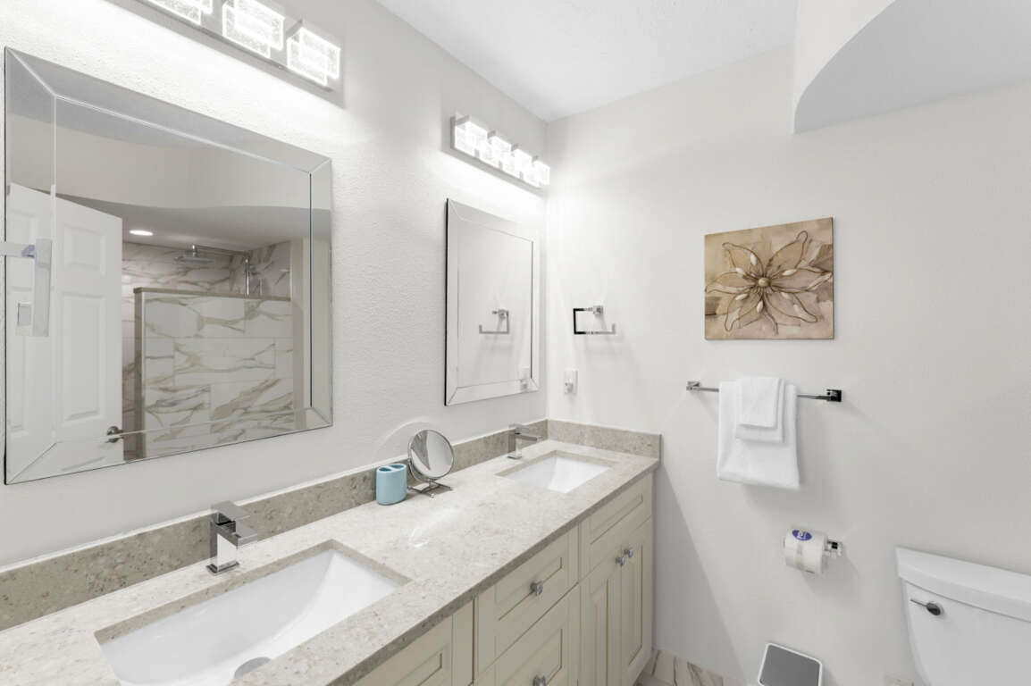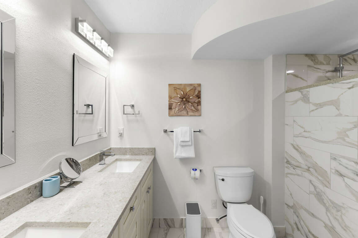 The primary bedroom features a plush king-size bed, an en-suite bathroom with a walk-in shower, and ample closet space. Wake up to gentle water views and coastal breezes. The second bedroom features a cozy queen-size bed and is perfect for family or friends. The second full bathroom, also fully updated, is conveniently located just down the hall.
