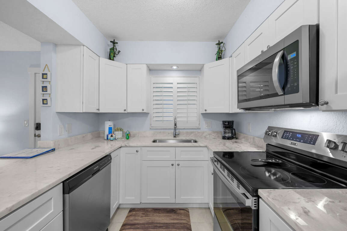 Fully updated kitchen featuring new cabinetry, stainless steel appliances, and marble-look countertops.