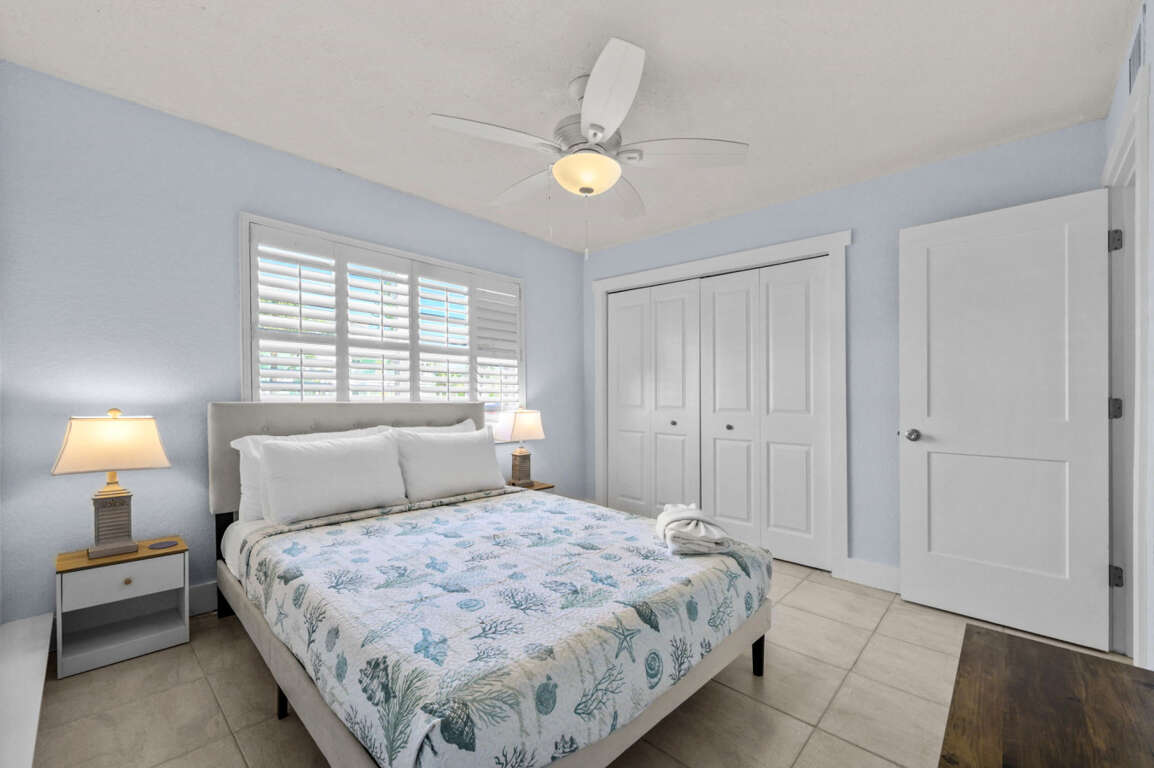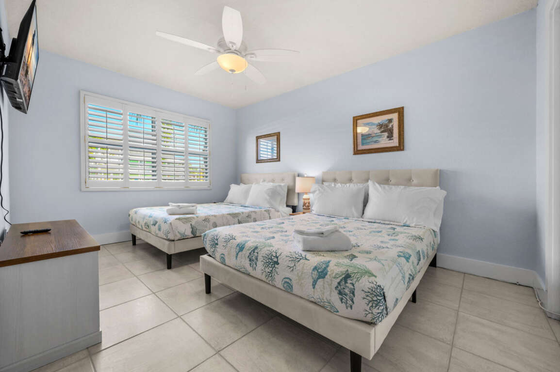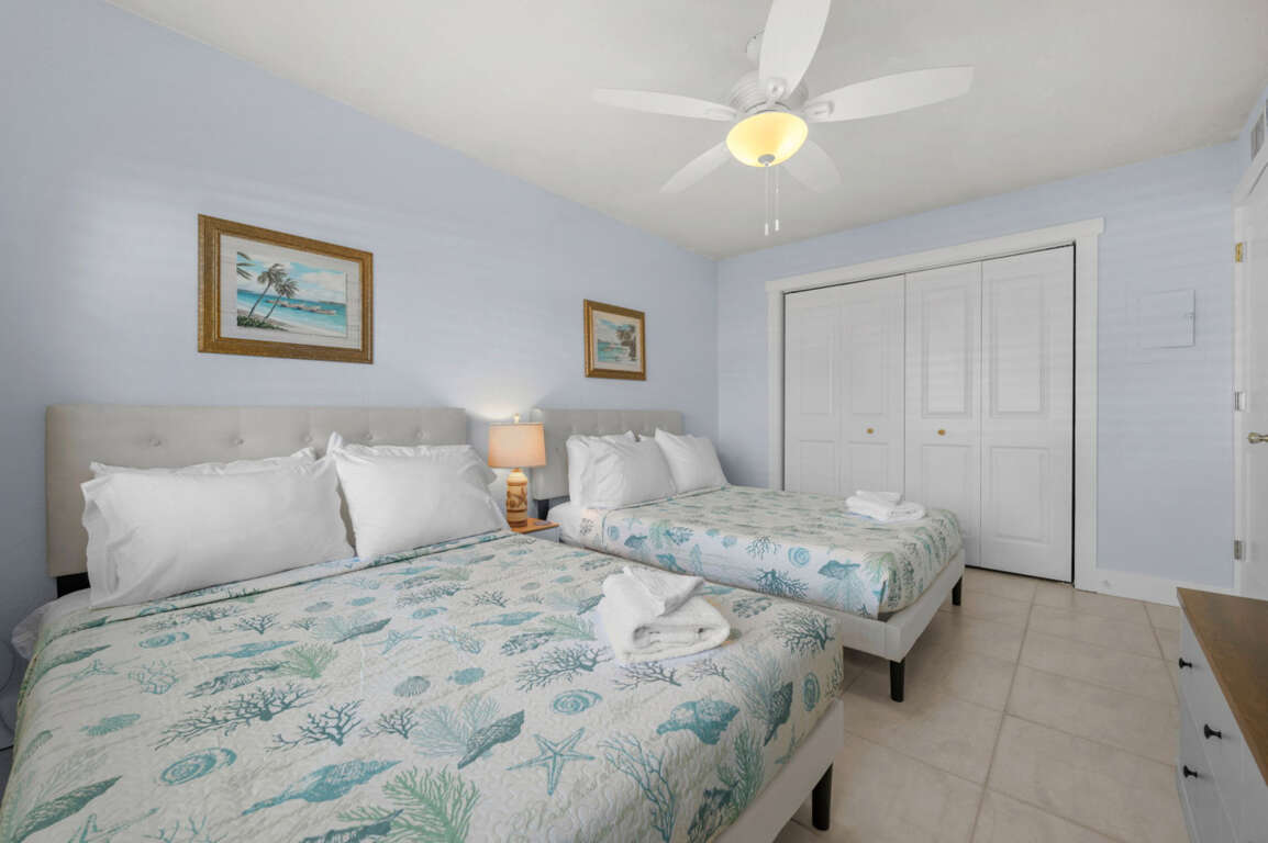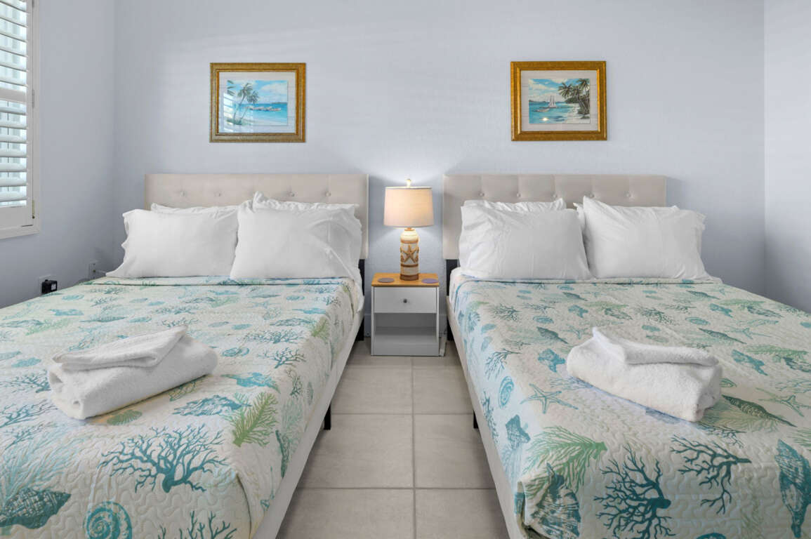 Two spacious bedrooms: one with a queen bed, the other with two full beds—both styled with fresh linens and beach-inspired accents.