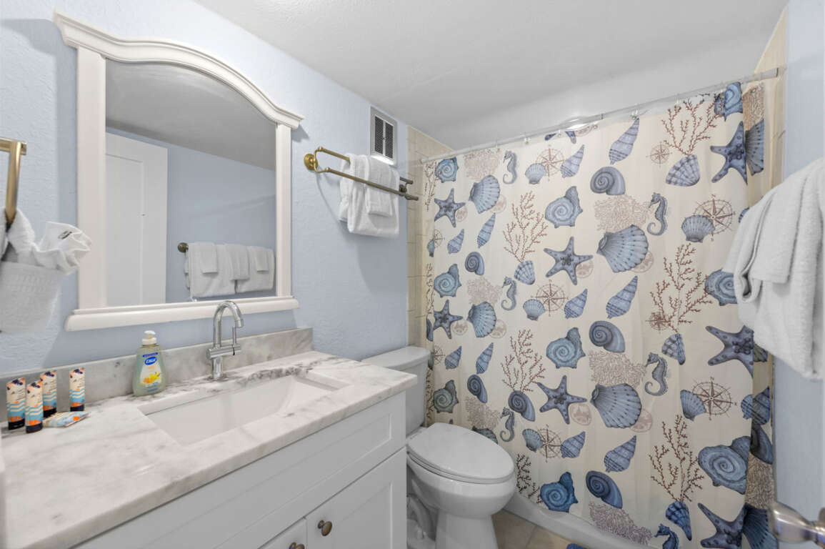 Renovated bathroom with a sleek vanity and fun, seaside-themed shower curtain.