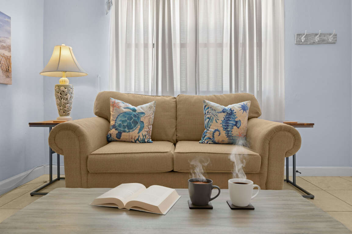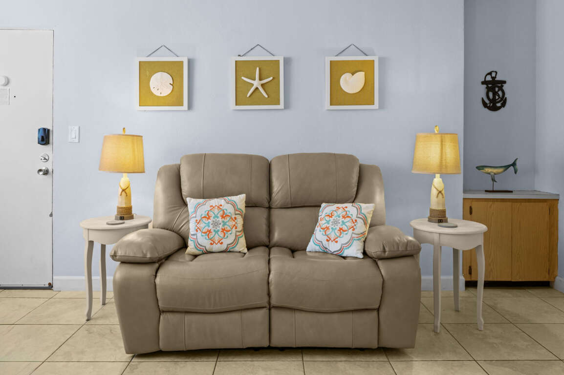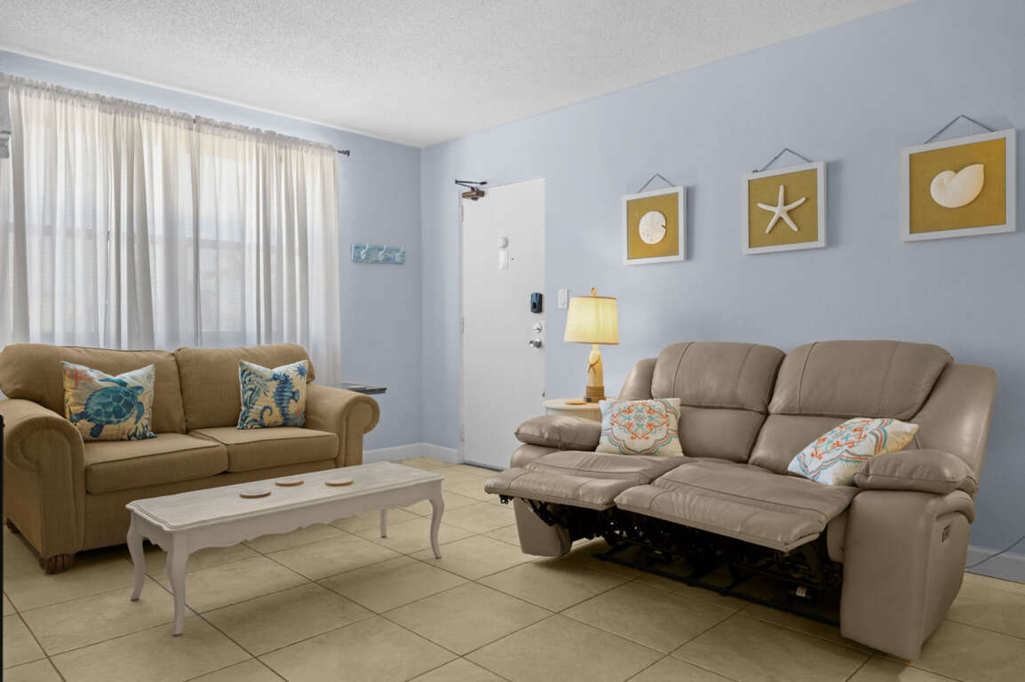 Living Room: Relax after a day at the beach in the bright and inviting living area, complete with plush seating, flat-screen TV, and coastal décor.
