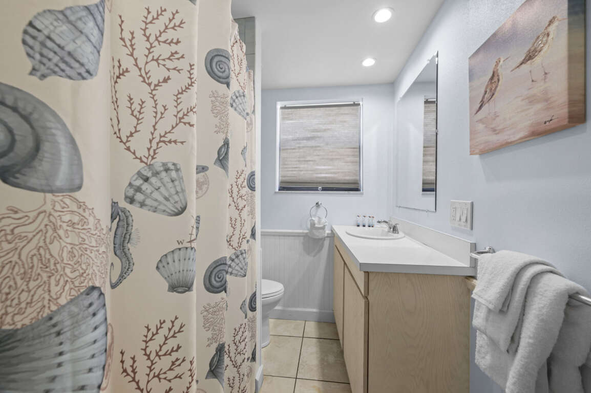 Bathroom: Updated and functional, featuring a tub/shower combo, fresh towels, and seaside touches.