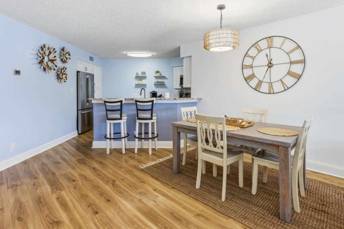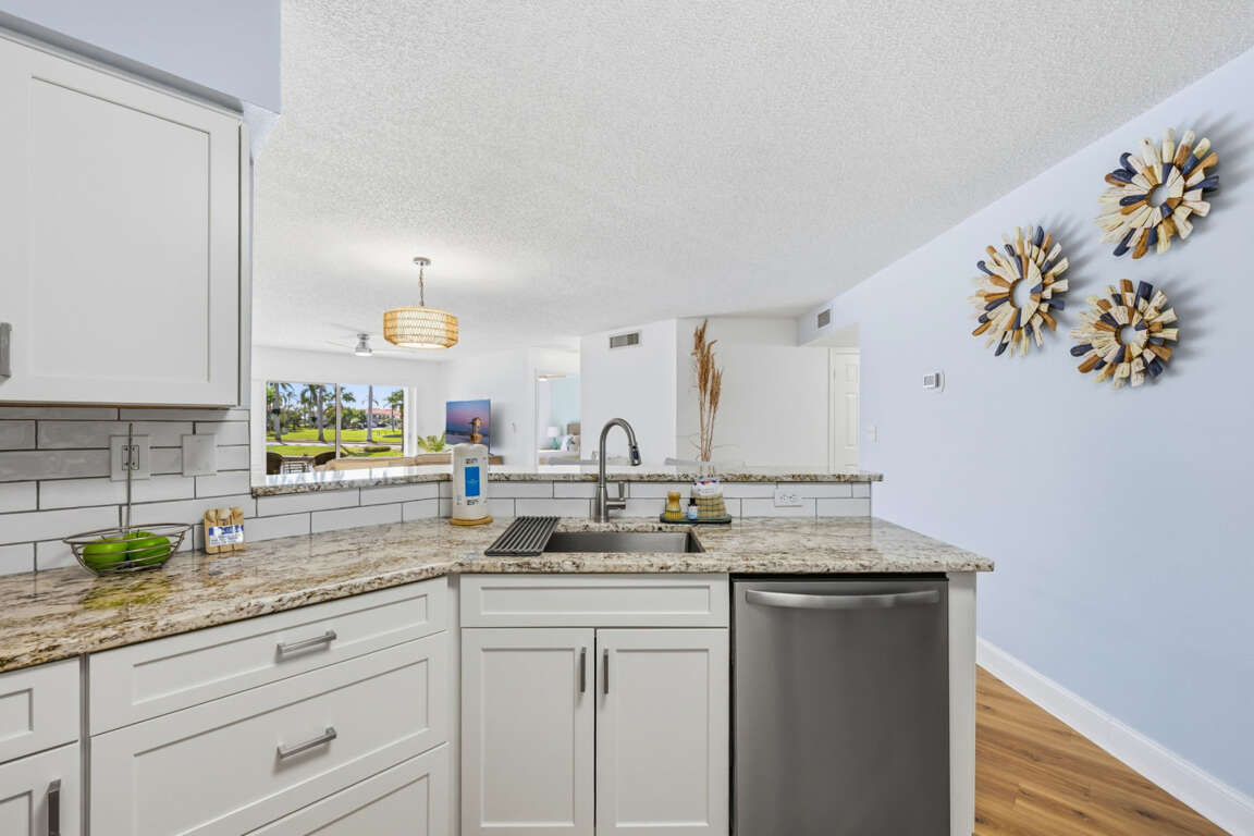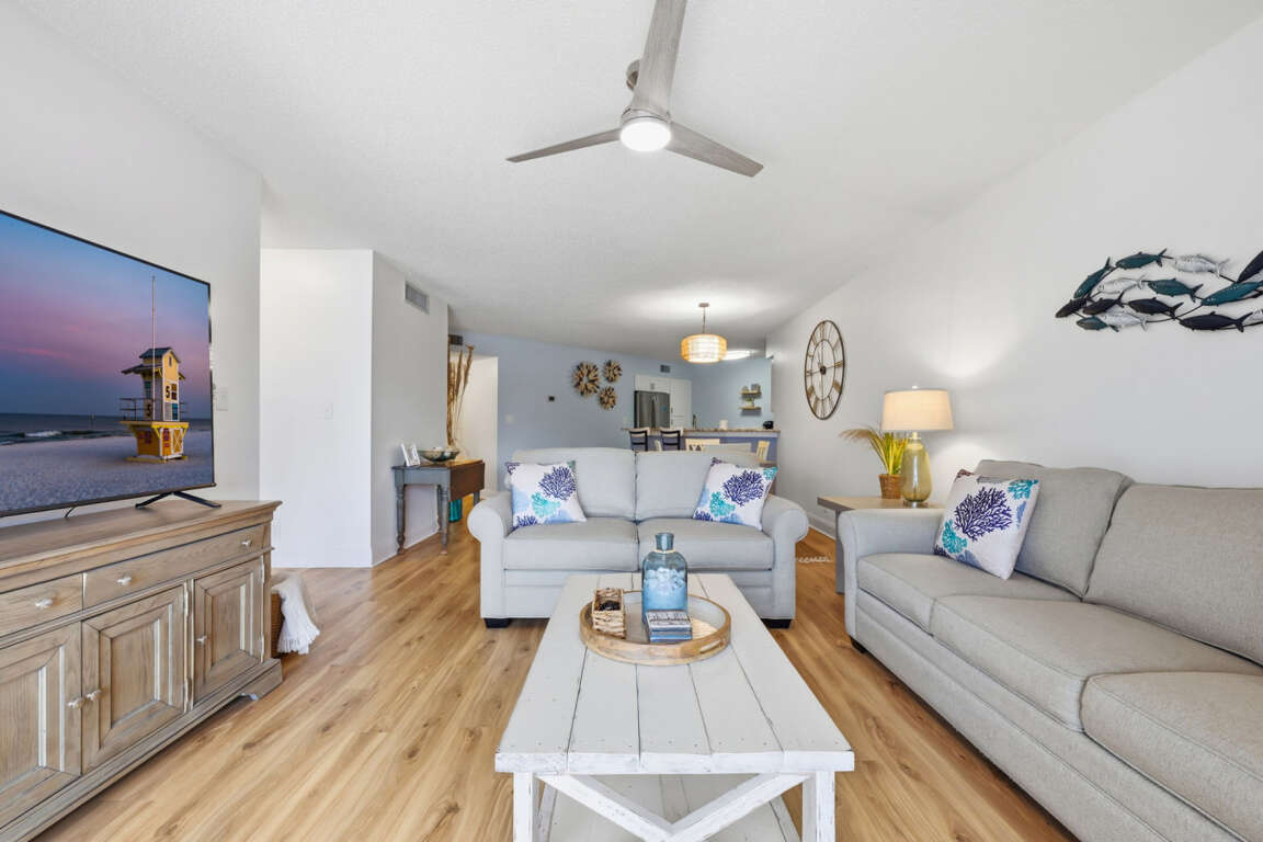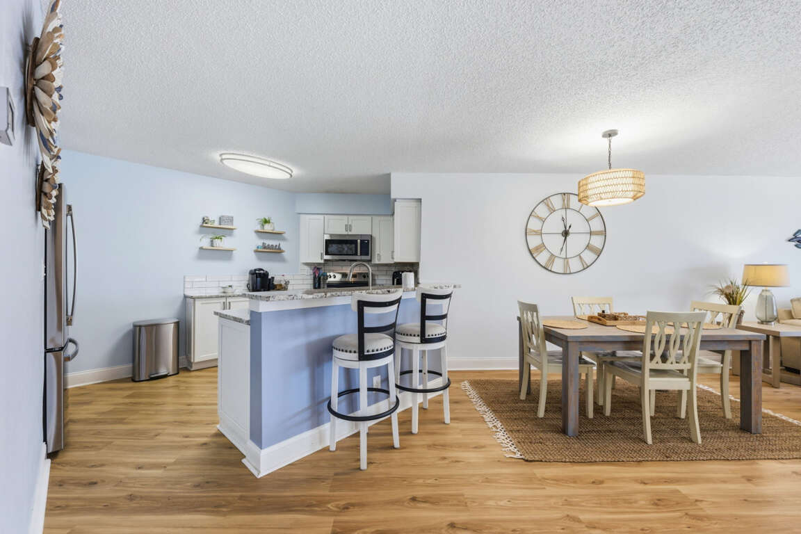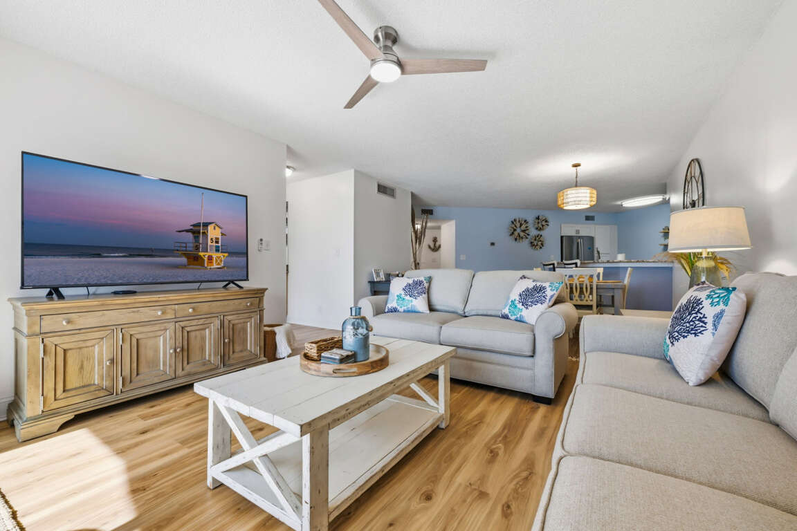 This two-bedroom, two-bath condo rental features a brand-new kitchen, stylish interior décor, and new living room furniture. The spacious layout comfortably accommodates up to six guests, making it perfect for families and small groups.