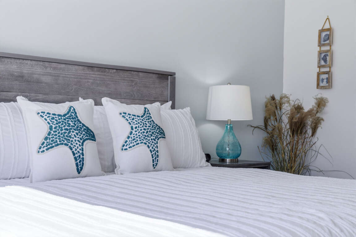 King bed in the master bedroom, queen and double beds in the guest bedroom, plus a sleeper sofa in the living room
