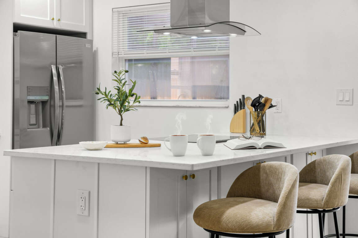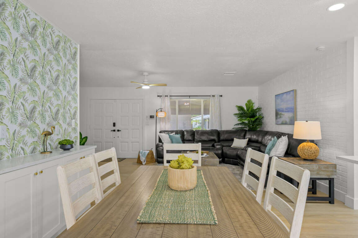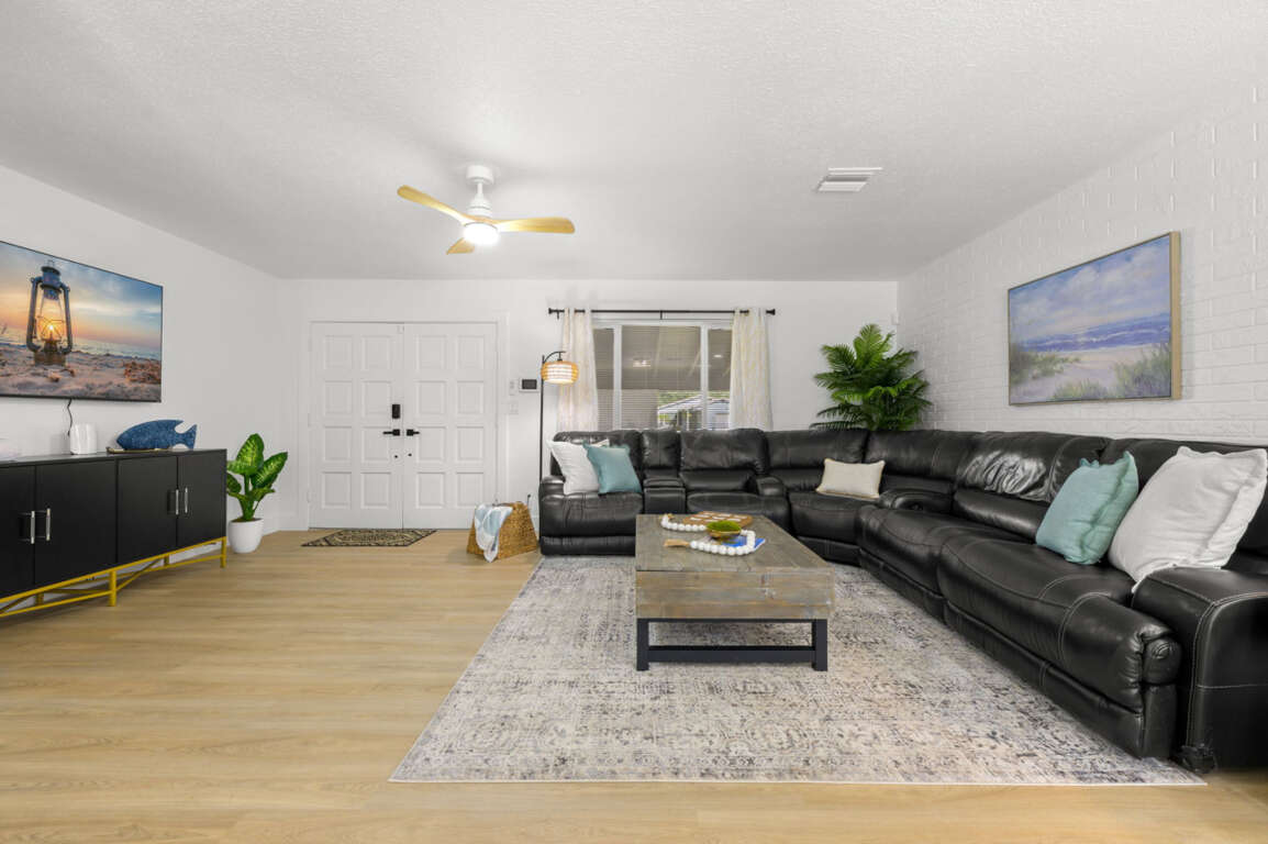 Step inside to a bright, open living area featuring a spacious leather sectional, Smart TV, and coastal-inspired décor. The open-concept layout flows effortlessly into a fully equipped kitchen with stainless steel appliances, quartz countertops, a Keurig coffee maker, and an island with seating for two. The adjoining dining area seats six, ideal for family dinners or game nights.