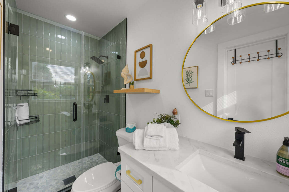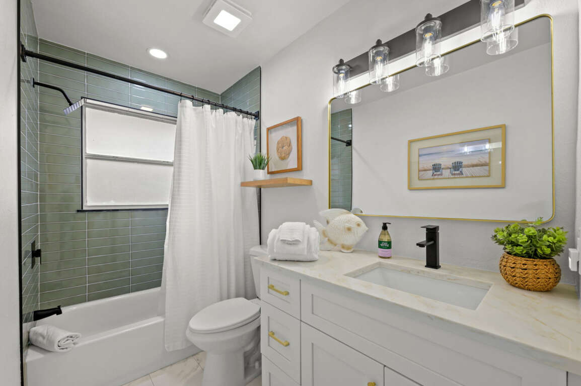 The guest bathroom includes a tub/shower combo, contemporary tilework, and gold accents, providing both style and comfort for your group.