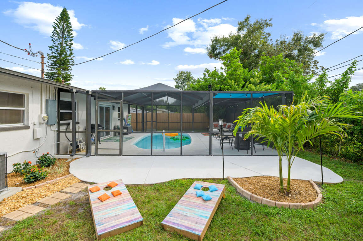 Step outside to your own private screened-in backyard oasis! Lounge by the sparkling heated pool, relax under the shaded patio, or enjoy a cookout on the BBQ grill. The outdoor space features a fire table, comfortable seating area, cornhole game, and a picnic table — perfect for spending quality time in the Florida sunshine.