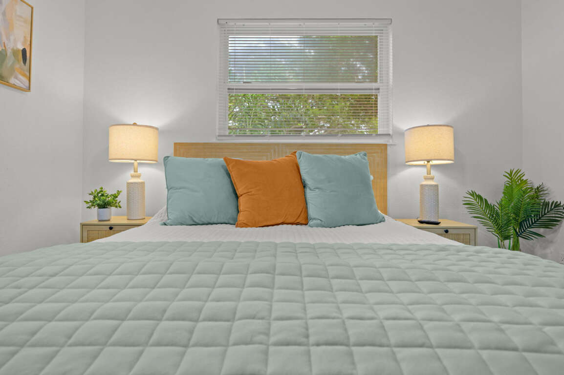 Bedroom 2: Queen bed, modern and airy design.