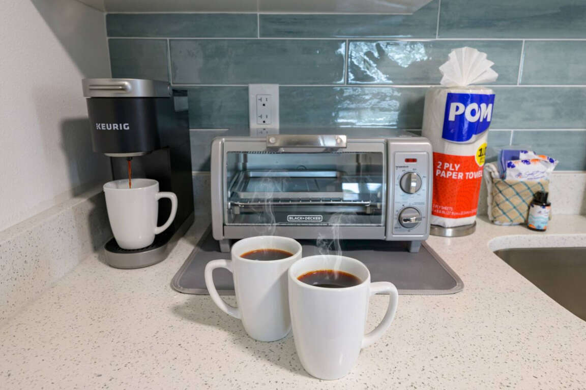 Fully Equipped Kitchenette: Stainless steel appliances, dishwasher, Keurig coffee maker