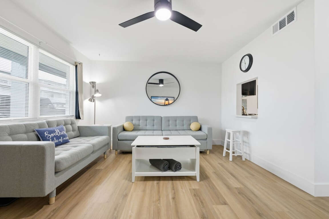 This ground-floor condo features a chic coastal design with luxury vinyl plank flooring, stylish furniture, and calming colors. The private bedroom has a comfortable Queen bed, and the living room includes a high-quality Queen pull-out sofa, comfortably accommodating up to 4 guests.