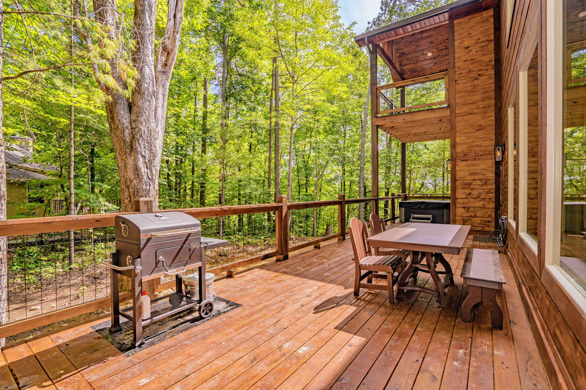 The exterior of the cabin is just as impressive as the interior. The outdoor fireplace is surrounded by comfortable seating, perfect for sharing stories and making memories. After a day of exploring the Great Smoky Mountains or enjoying the thrills at Dollywood, unwind in the hot tub and take in the peaceful surroundings.