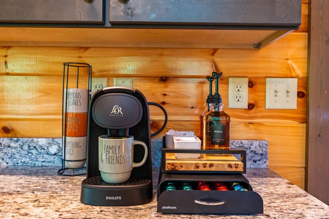 - Starter supply of coffee pods, sweetener, creamer, and coffee syrups