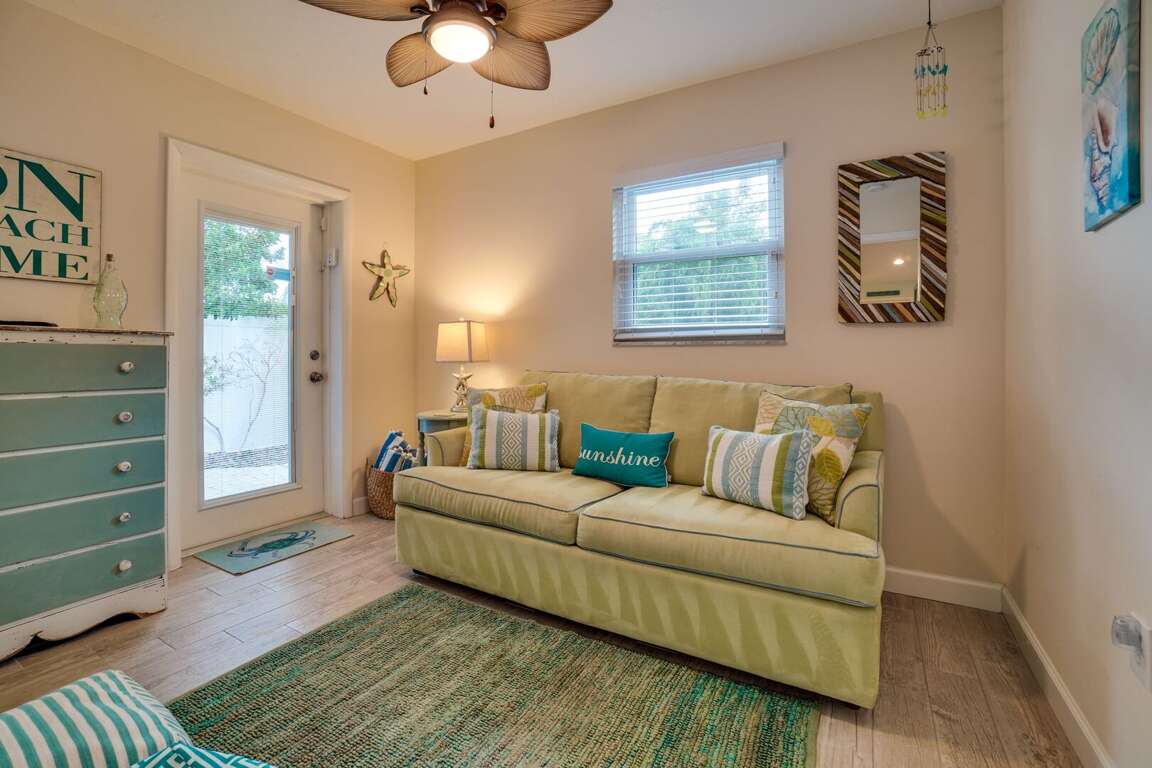 Adorned in soothing sand tones with accents of beachy teal, the living space of Seaglass Cottage exudes coastal charm and relaxation for guests seeking a tranquil retreat in Anna Maria, Florida. The color scheme creates a serene ambiance, complemented by carefully selected furniture that blends style with comfort. Natural light floods the open living room, enhanced by tropical fans that add a touch of tropical flair. Ample storage options are discreetly integrated into the decor, ensuring a clutter-free environment. Thoughtful lighting fixtures throughout the space create a warm and inviting atmosphere for gatherings or quiet evenings in. The living space at Seaglass Cottage is designed to provide a cozy yet stylish setting for guests to unwind and enjoy their beach getaway.