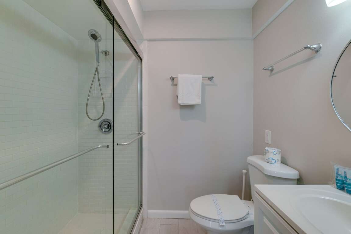 Down the hall, you will find two serene bedrooms: the primary suite features a plush king-size bed and a private ensuite with a walk-in shower. The guest bedroom offers a comfortable queen-size bed and easy access to a hallway bathroom with a shower/tub combo.