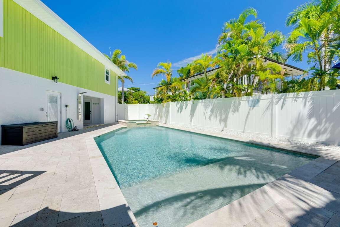 But the real place to be is outside! Head to your private backyard oasis, where you'll find a pool and spa with a sun shelf, perfect for soaking up the Florida sunshine, lounge chairs for sunbathing and unwinding, an outdoor shower for rinsing off after beach days and a cozy seating area with an outdoor tv for movie nights. Additional amenities include a 3rd full bathroom, an indoor dining space at the back of the home and a spare refrigerator in the garage for all your drinks and snacks.