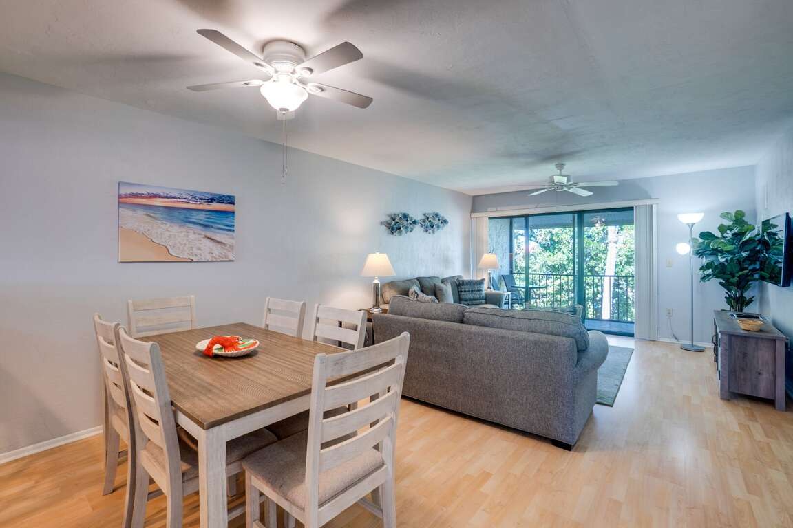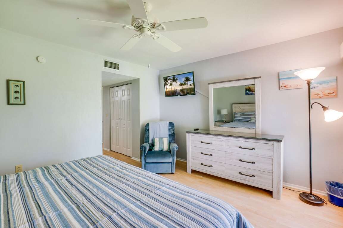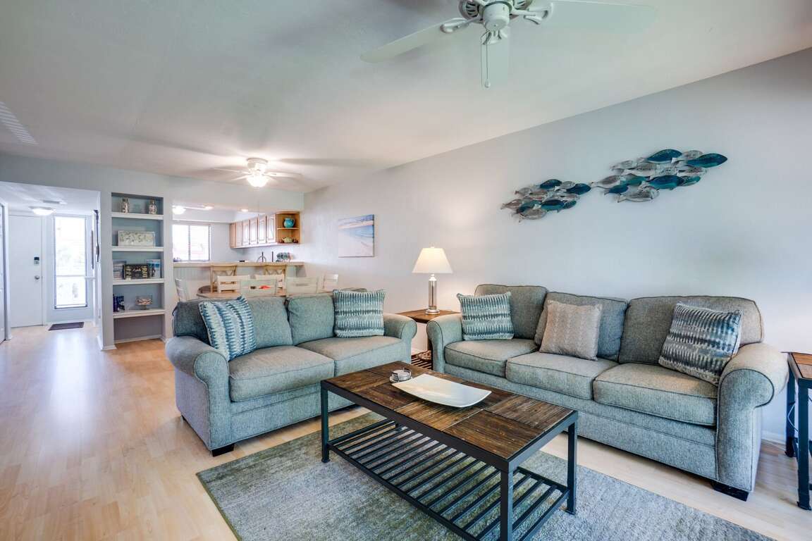 Welcome to this 2-bedroom, 2-bathroom end unit condo, perfect for your next getaway. Sun Stack is a 1/2 block away from the beautiful Bradenton Beach. Inside, you'll find a fully equipped kitchen with sleek stainless steel appliances, a spacious dining area and living room, which has a sleeper sofa, that opens to a private balcony with outdoor seating and peaceful views of the secluded backyard. The primary bedroom features a comfortable king bed while the guest bedroom offers a queen bed and a twin bed, perfect for families or friends. There's also 2 bathrooms, one with a shower/tub combo and the primary bathroom being a stand-up shower.
