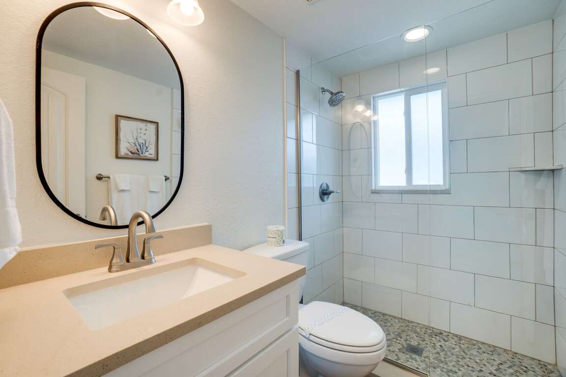 Inside, the primary bedroom features a comfortable king bed, while the guest bedroom offers two cozy twin beds and living room has a sleeper sofa, perfect for families or friends. The modern kitchen includes stainless steel appliances, a dining area, and a laundry closet for your convenience.