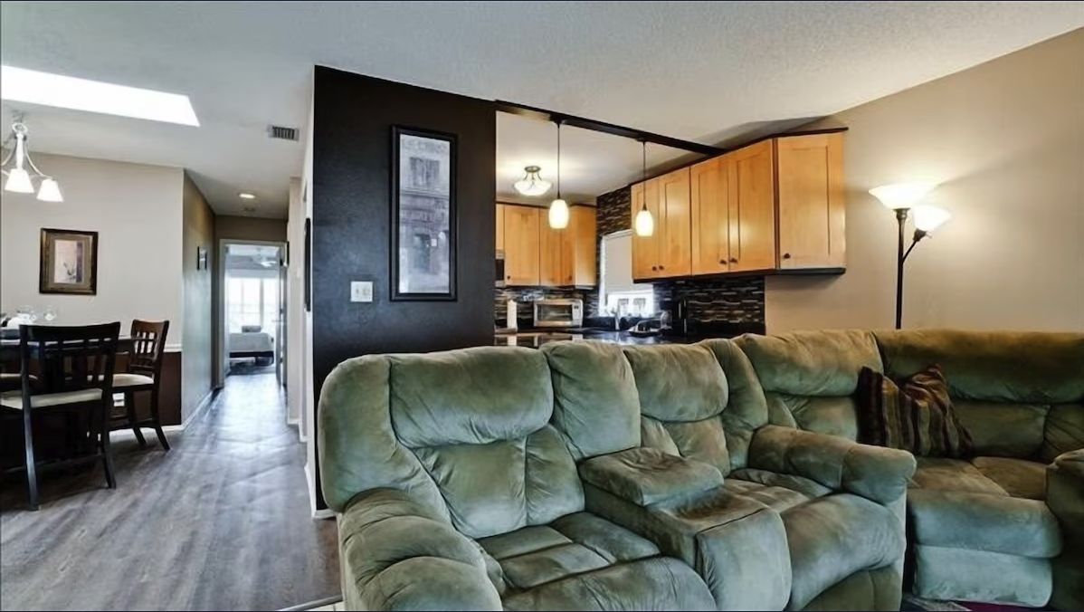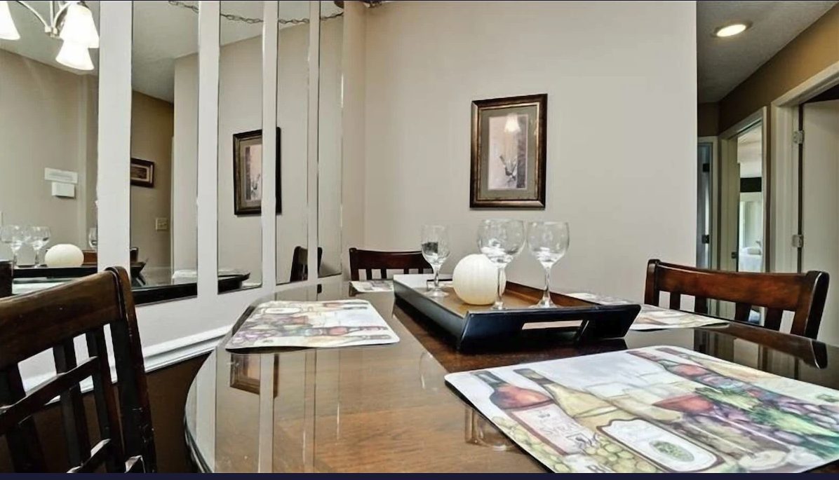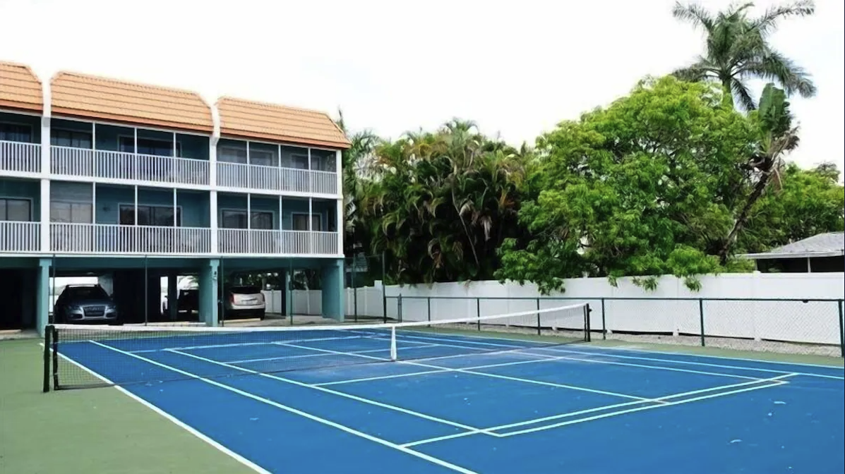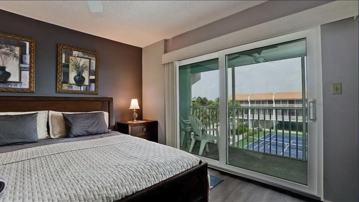 The kitchen boasts sleek stainless steel appliances and granite countertops, making meal prep a breeze. Adjacent to the kitchen, the dining room features a skylight that fills the space with warm, natural light, perfect for breakfast or a cozy dinner. The first bathroom also includes a convenient in-unit washer and dryer. The primary bedroom offers a king-sized bed and its own private balcony overlooking the tennis courts, providing a quiet retreat. The second bedroom is ideal for family or guests, with a queen-size bed and a twin bed to accommodate multiple sleepers comfortably.