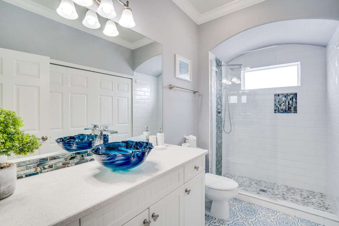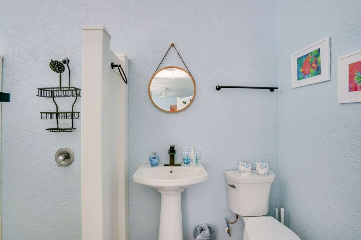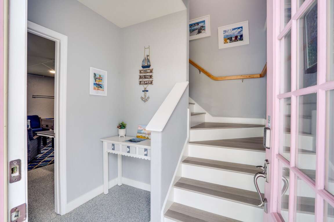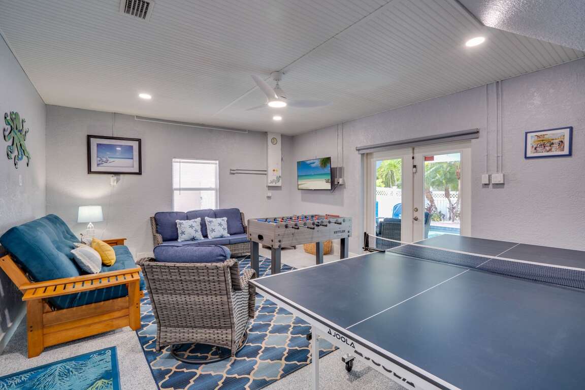 The moment you step inside, you’ll feel the easygoing island vibe. The first floor is all about fun and comfort, featuring a spacious game room complete with a foosball table, TV, and futon couch, a perfect hangout for both kids and adults. The garage houses a ping pong table, so the friendly competitions never have to end! Step through the doors and find yourself in a private backyard oasis. Take a refreshing dip in the sparkling pool, bask in the sun on the loungers, or fire up the grill for an outdoor barbecue. There’s plenty of dining space for everyone to gather and enjoy meals surrounded by tropical greenery. There's also lawn Connect Four and a basketball net for the pool. For your convenience, there’s also a fully equipped outdoor bathroom featuring a toilet, sink, and hot water shower, perfect for rinsing off after a beach day or pool session without having to head inside.