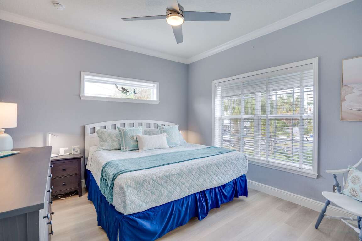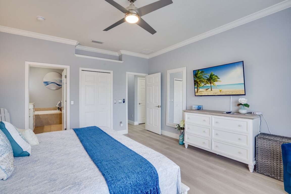 Primary Suite: Relax in the spacious primary bedroom featuring a king bed with a trundle in the room. The ensuite bathroom offers a touch of luxury with a jetted soaking tub and a large separate shower. Second Bedroom: This room offers a king bed and serene coastal décor. Third Bedroom: Perfect for families, this room includes a queen bed and twin bed, along with a desk in case you need to catch up on work during your stay.