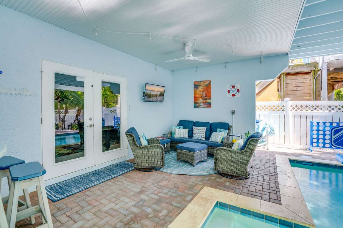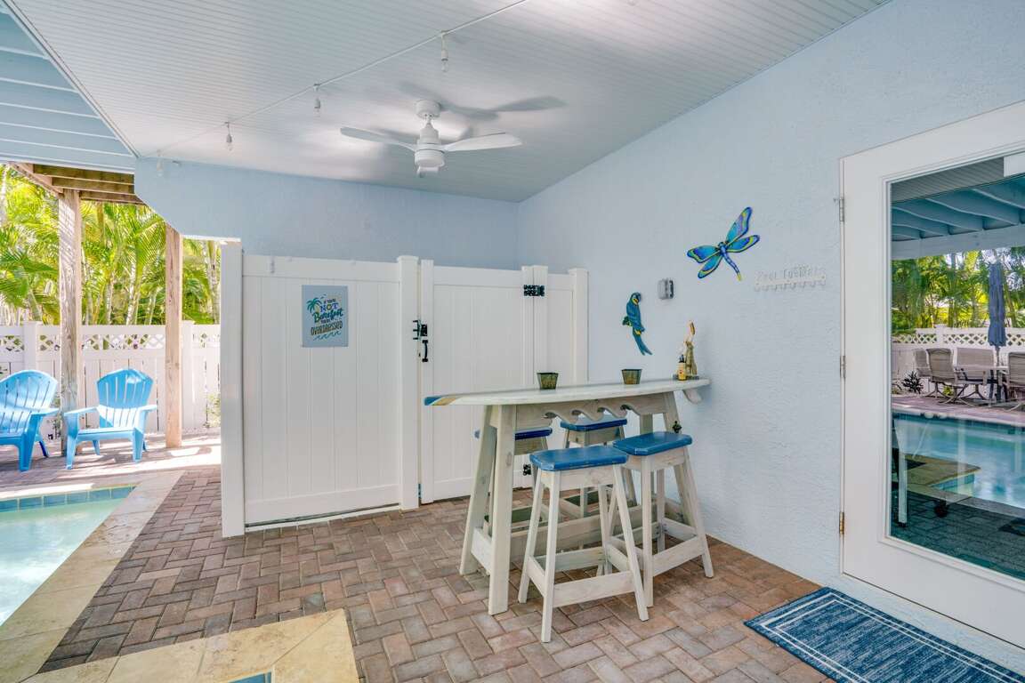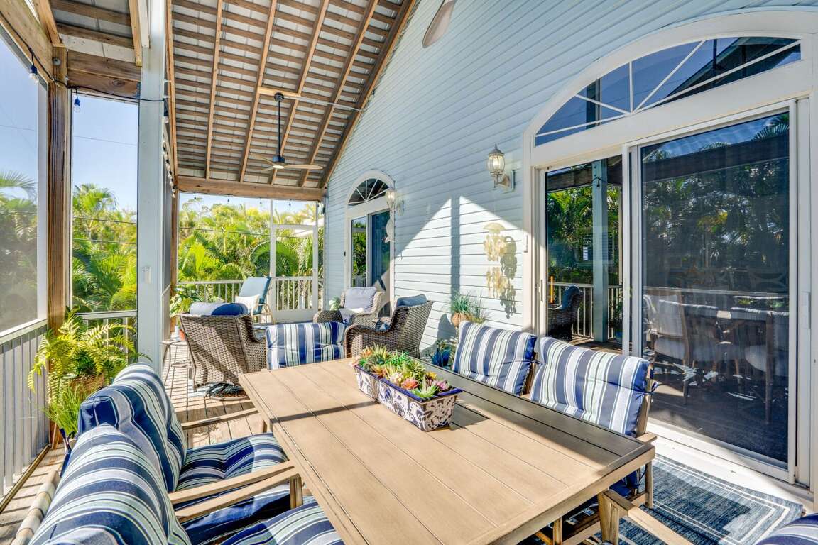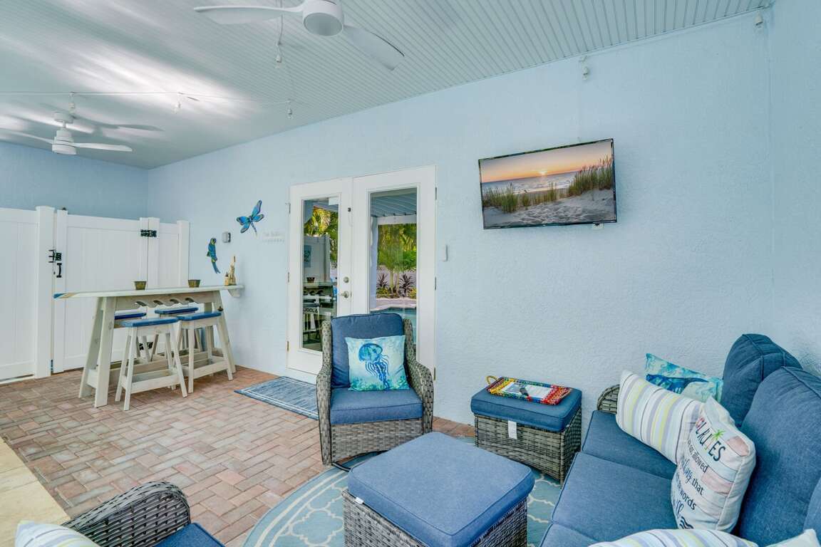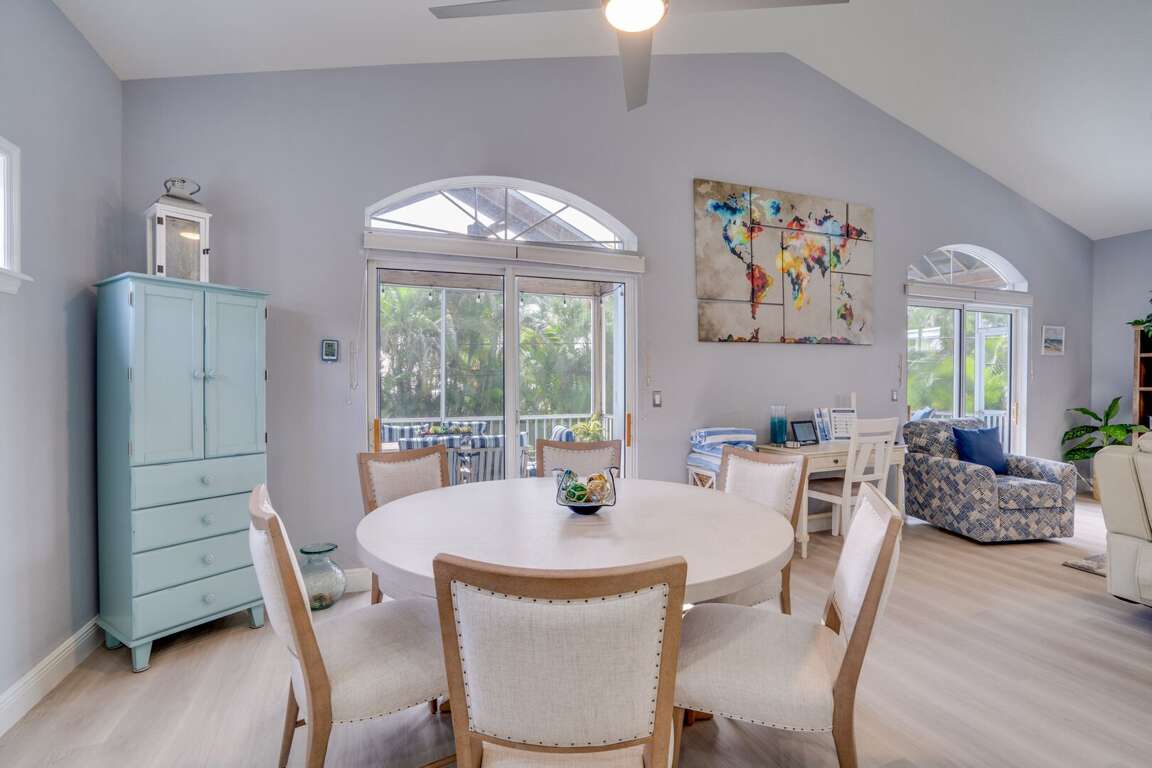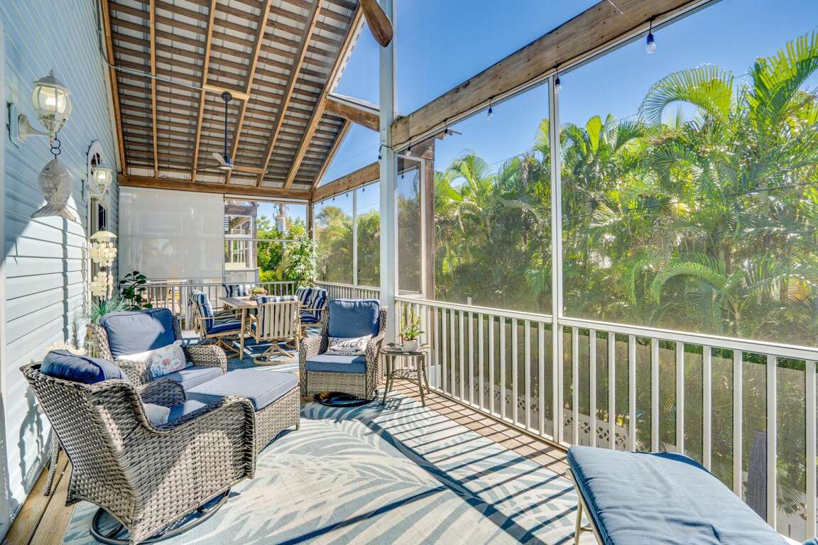 One of the highlights of the home is the screened-in balcony that overlooks the lush backyard. With plenty of seating for everyone, it’s the perfect place to sip your morning coffee, read a good book, or unwind with a cocktail while the sun sets behind the palms. This is your private sanctuary — peaceful, breezy, and surrounded by tropical beauty.