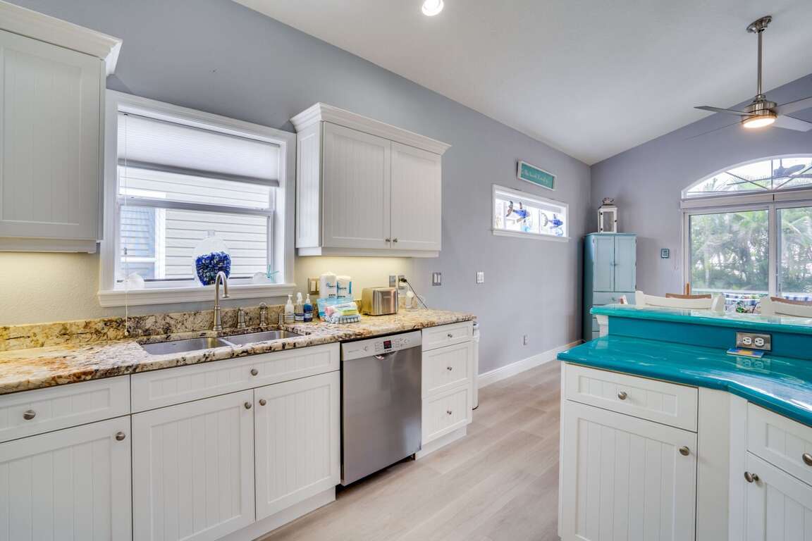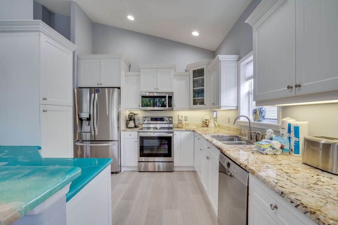 Upstairs, you’ll find the home’s main living area, designed for both relaxation and connection. The bright and airy open floor plan features a spacious family room, a large dining area, and a beautifully updated kitchen. The kitchen is equipped with stainless steel appliances, a coastal epoxy countertop, and everything you need to prepare meals and snacks with ease.