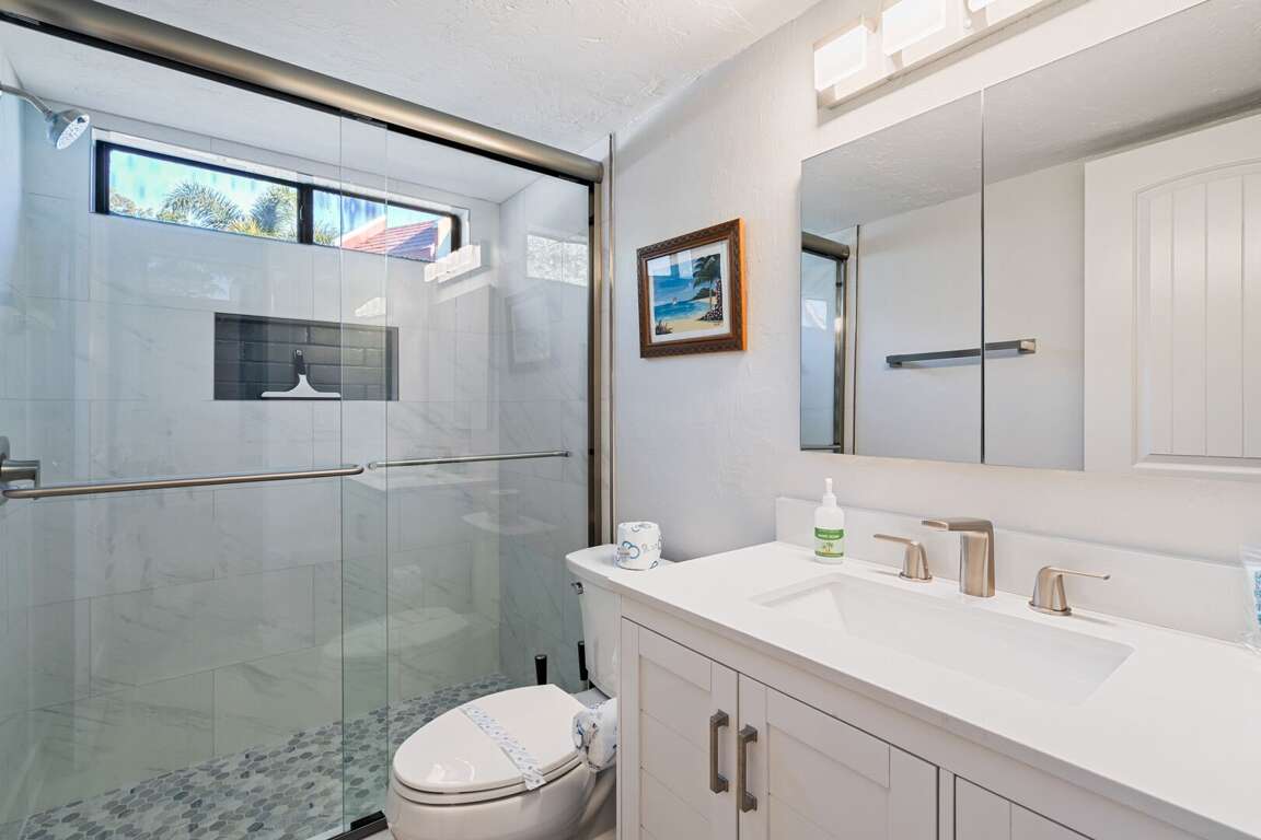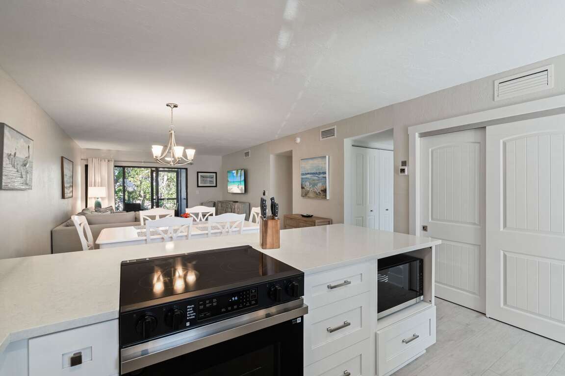 The primary bedroom boasts a king bed, private ensuite bathroom with a walk-in shower, and serene views of the bay right from your window. The second bedroom features two full-size beds and is conveniently located near the hallway bathroom, which also includes a walk-in shower, perfect for families or friends traveling together. The fully renovated kitchen is a standout, complete with beautiful new countertops, a modern backsplash, and brand-new appliances that make cooking a pleasure. Unwind in the inviting living room, furnished with a cozy sectional sofa (which converts to a sleeper sofa) and contemporary décor, ideal for relaxing after a day at the beach.