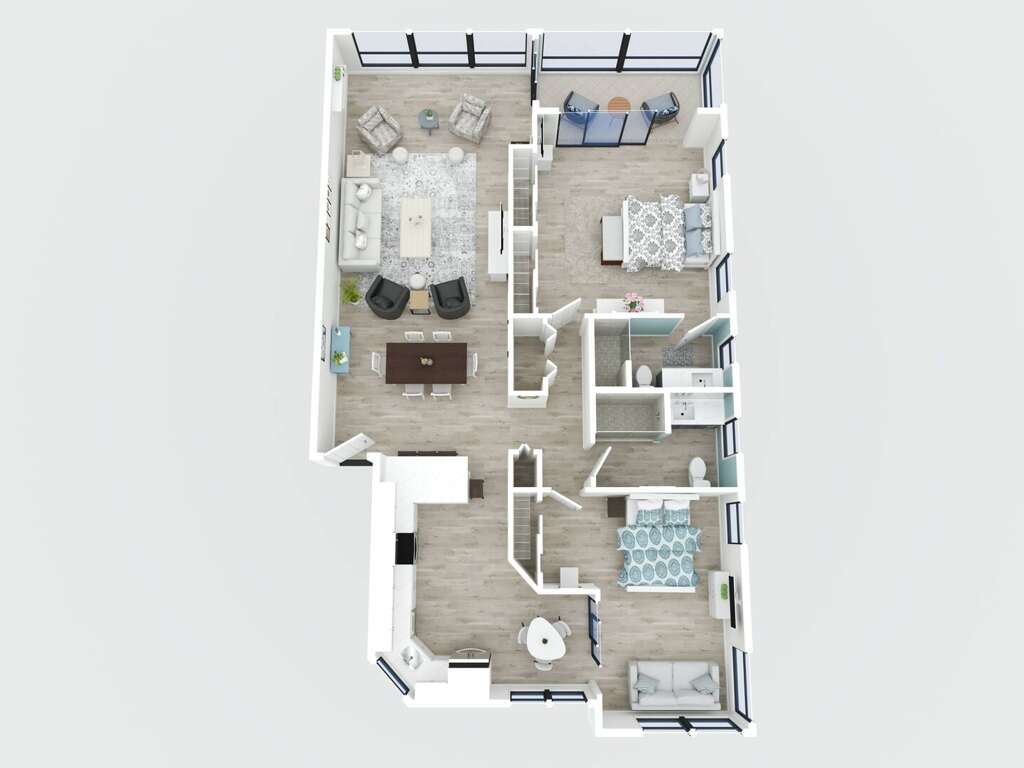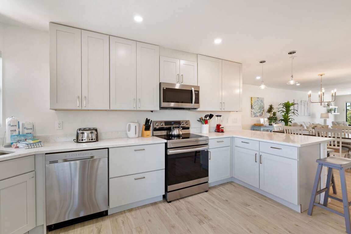 Inside, the open layout feels bright and breezy, with calming coastal colors, a comfortable seating area with a flat-screen TV, and a fully equipped kitchen featuring stainless steel appliances and all the cookware you’ll need. Whether you’re enjoying a casual breakfast at the kitchen bar or gathering for dinner at the dining table, the space is designed to make you feel right at home.