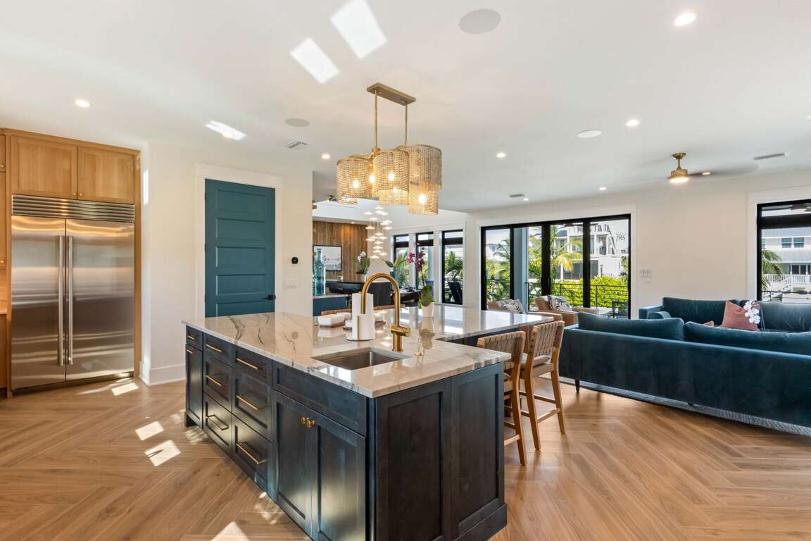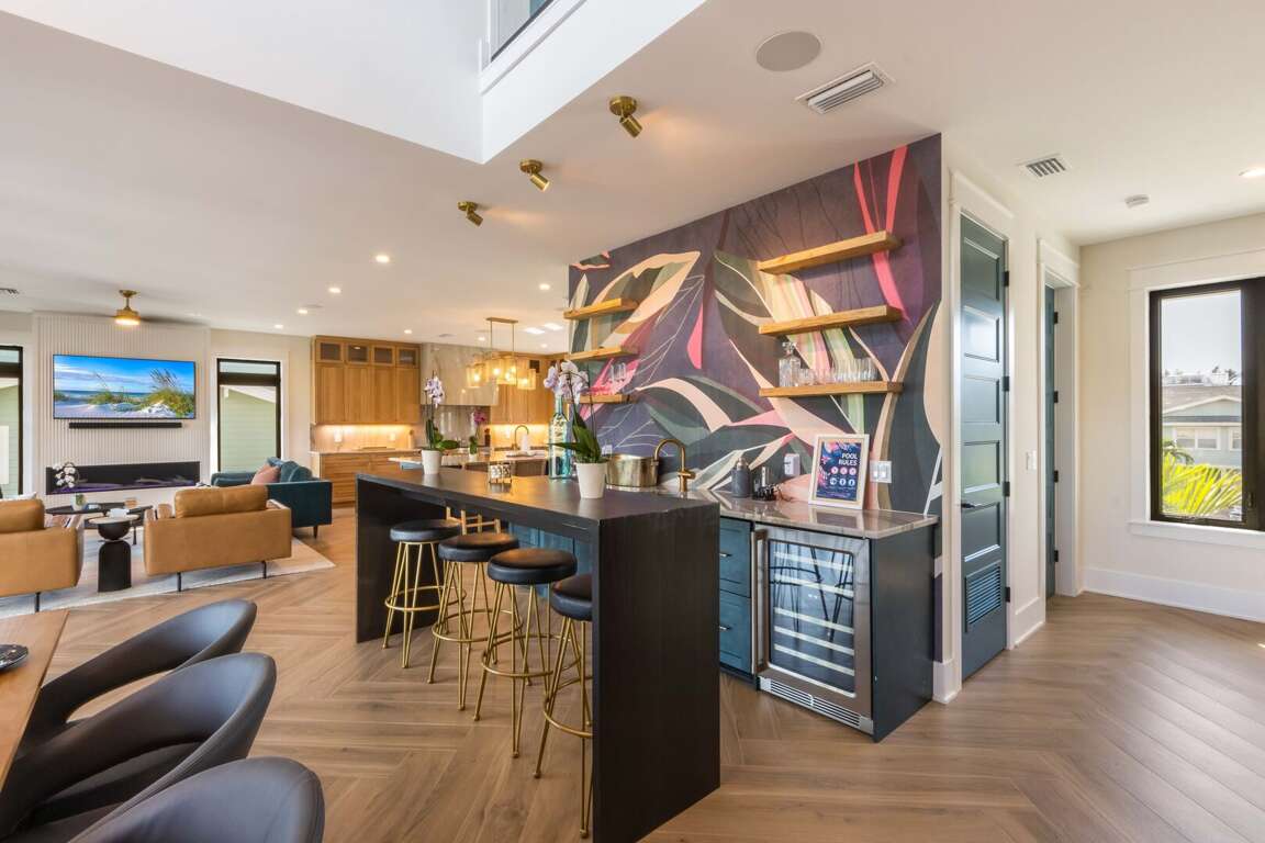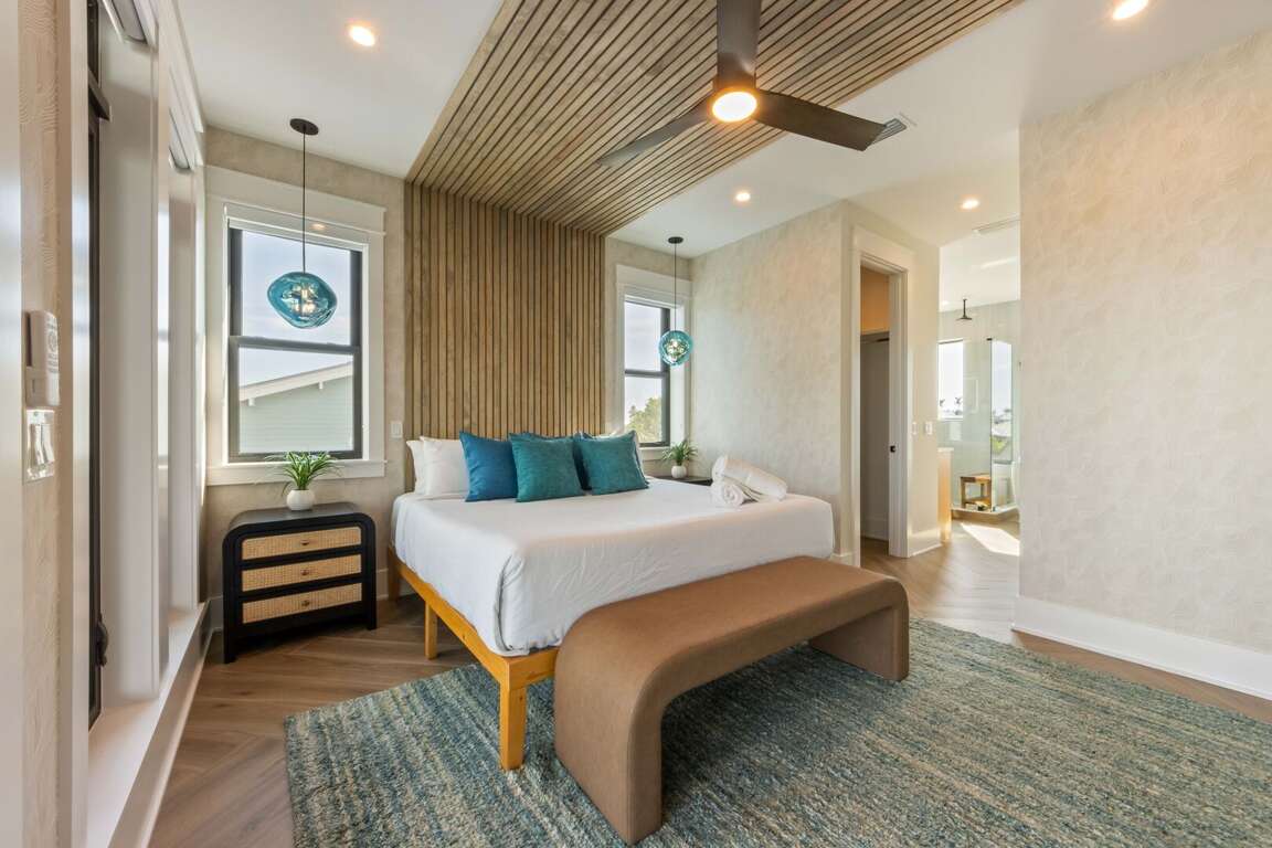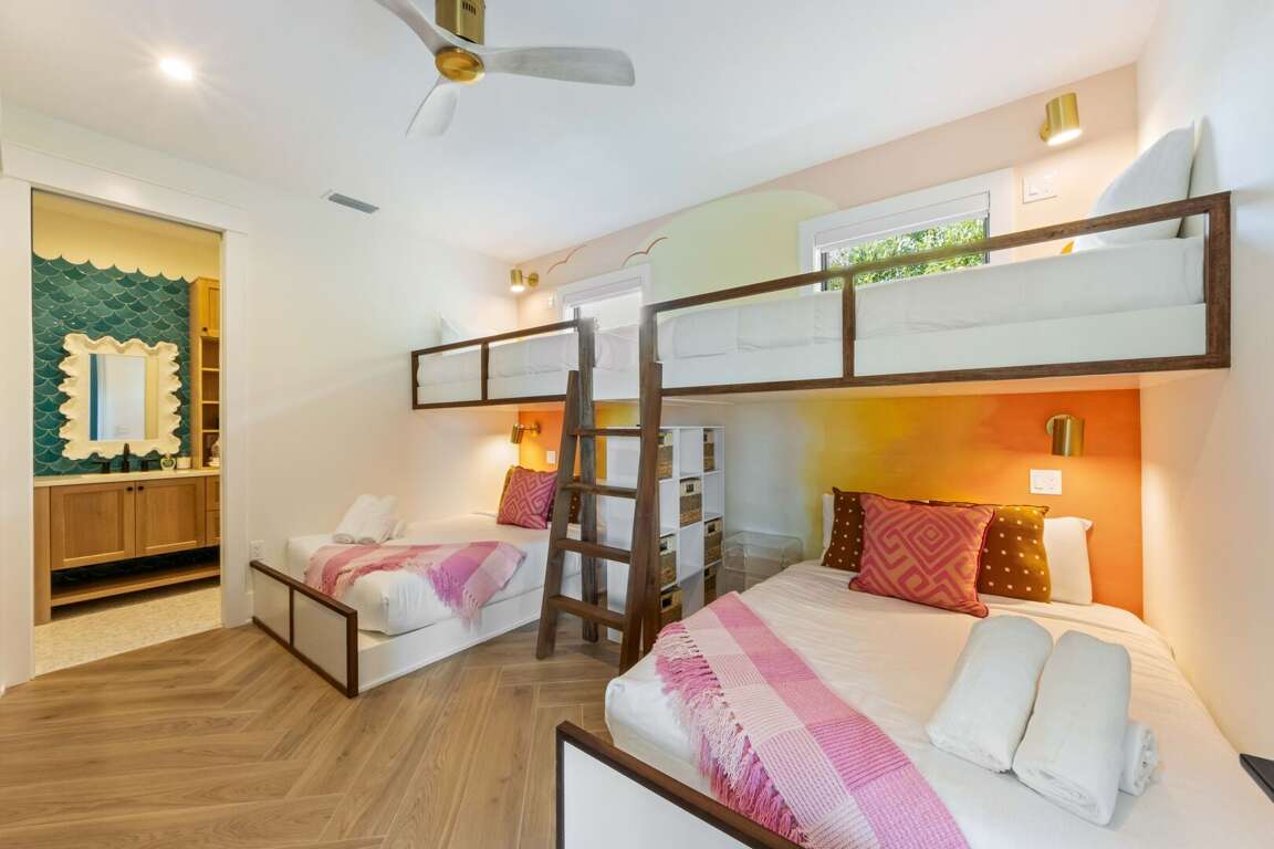 Inside, the home is bright, open, and perfect for spending time together. The living area is filled with natural light and flows easily into the gourmet kitchen, where high-end appliances, a large island, and plenty of workspace make cooking a pleasure—whether you’re making a quick breakfast or a full family dinner. A wet bar, private office space, washer and dryer, complimentary WiFi, and both Keurig and drip coffee makers add everyday convenience, while an elevator provides easy access to all floors except the rooftop. Bimini Sunrise comfortably sleeps up to eight guests across four spacious bedrooms, each with its own en-suite bathroom and TV. Three of the bedrooms feature king beds, while the fourth is perfect for kids or extra guests with two twin-over-full bunk beds. The primary suite is especially relaxing, with a soaking tub and walk-in shower, and all bedrooms are outfitted with high-quality linens to ensure a great night’s sleep.