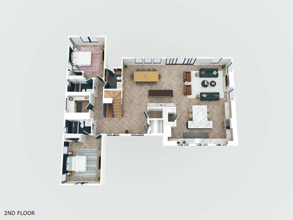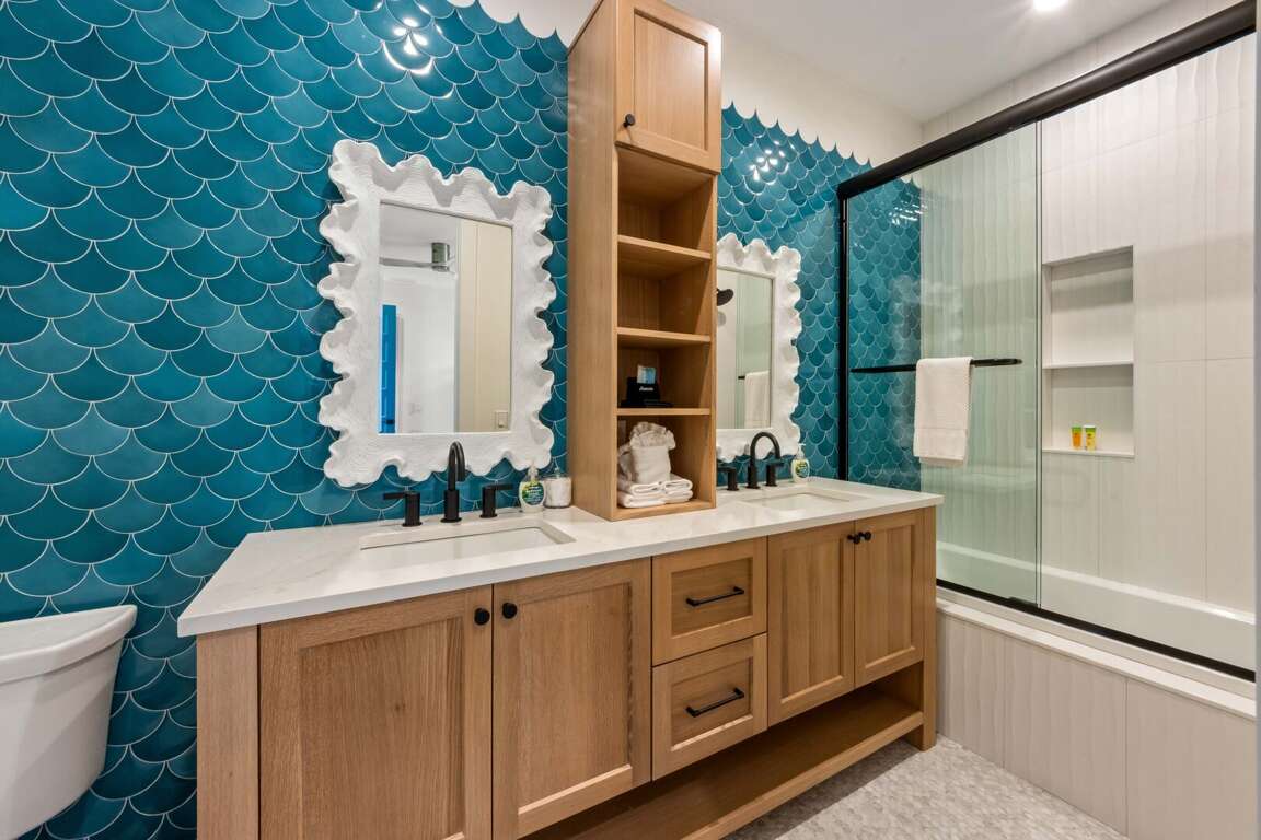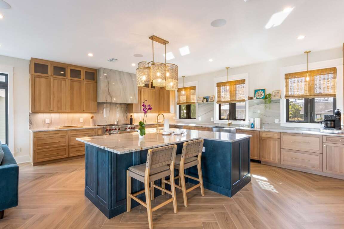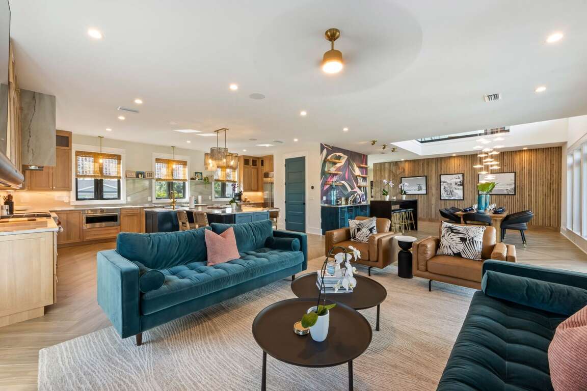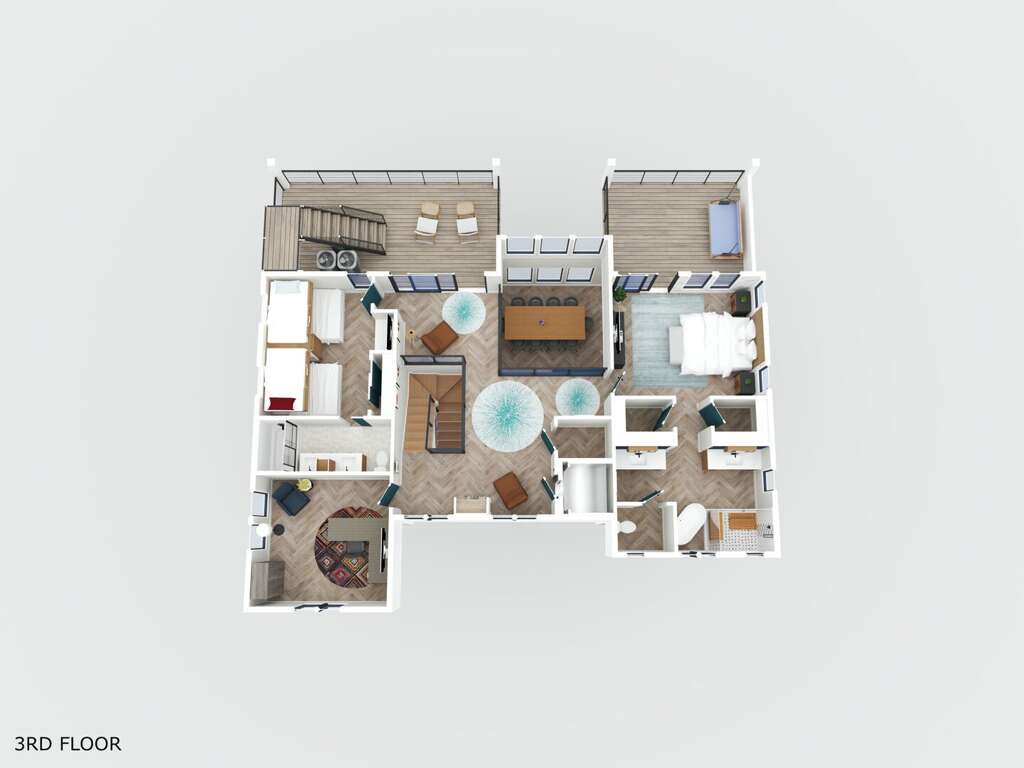 Inside, the home is bright, open, and perfect for spending time together. The living area is filled with natural light and flows easily into the gourmet kitchen, where high-end appliances, a large island, and plenty of workspace make cooking a pleasure—whether you’re making a quick breakfast or a full family dinner. A wet bar, private office space, washer and dryer, complimentary WiFi, and both Keurig and drip coffee makers add everyday convenience, while an elevator provides easy access to all floors except the rooftop. Bimini Sunrise comfortably sleeps up to eight guests across four spacious bedrooms, each with its own en-suite bathroom and TV. Three of the bedrooms feature king beds, while the fourth is perfect for kids or extra guests with two twin-over-full bunk beds. The primary suite is especially relaxing, with a soaking tub and walk-in shower, and all bedrooms are outfitted with high-quality linens to ensure a great night’s sleep.