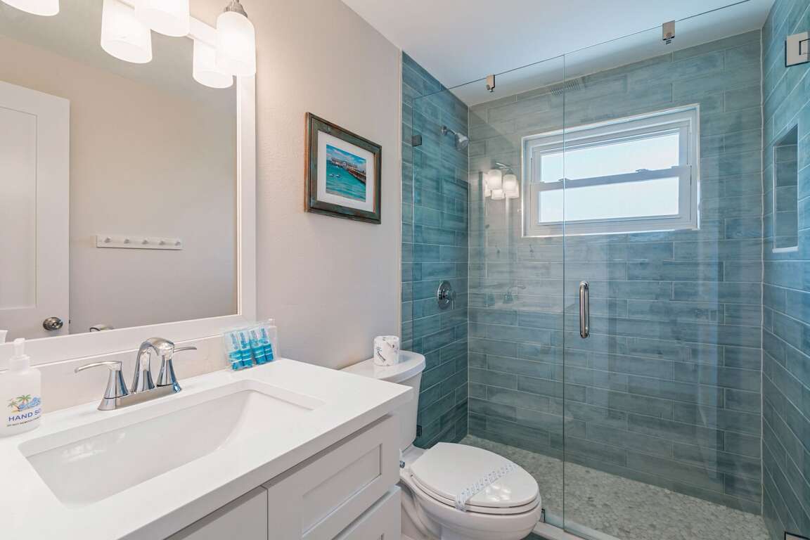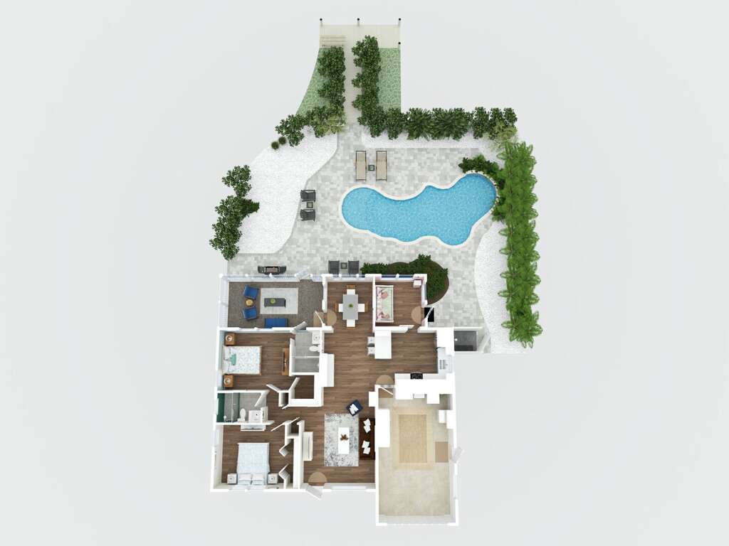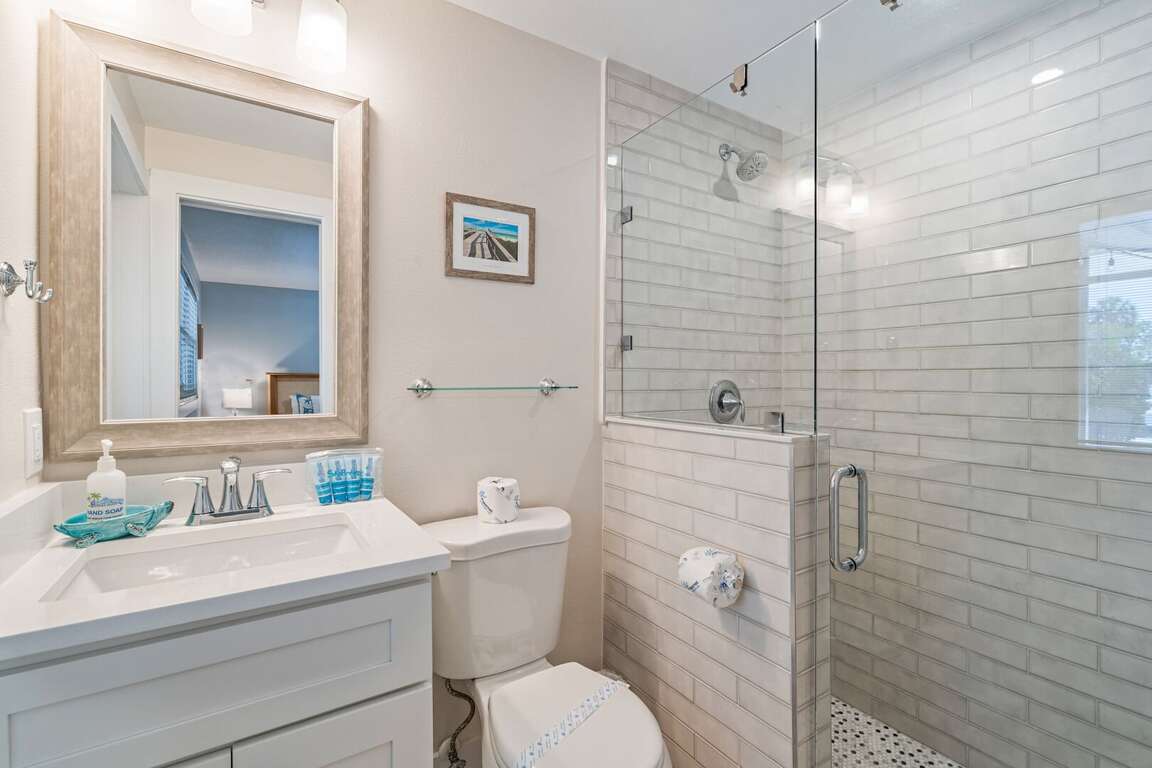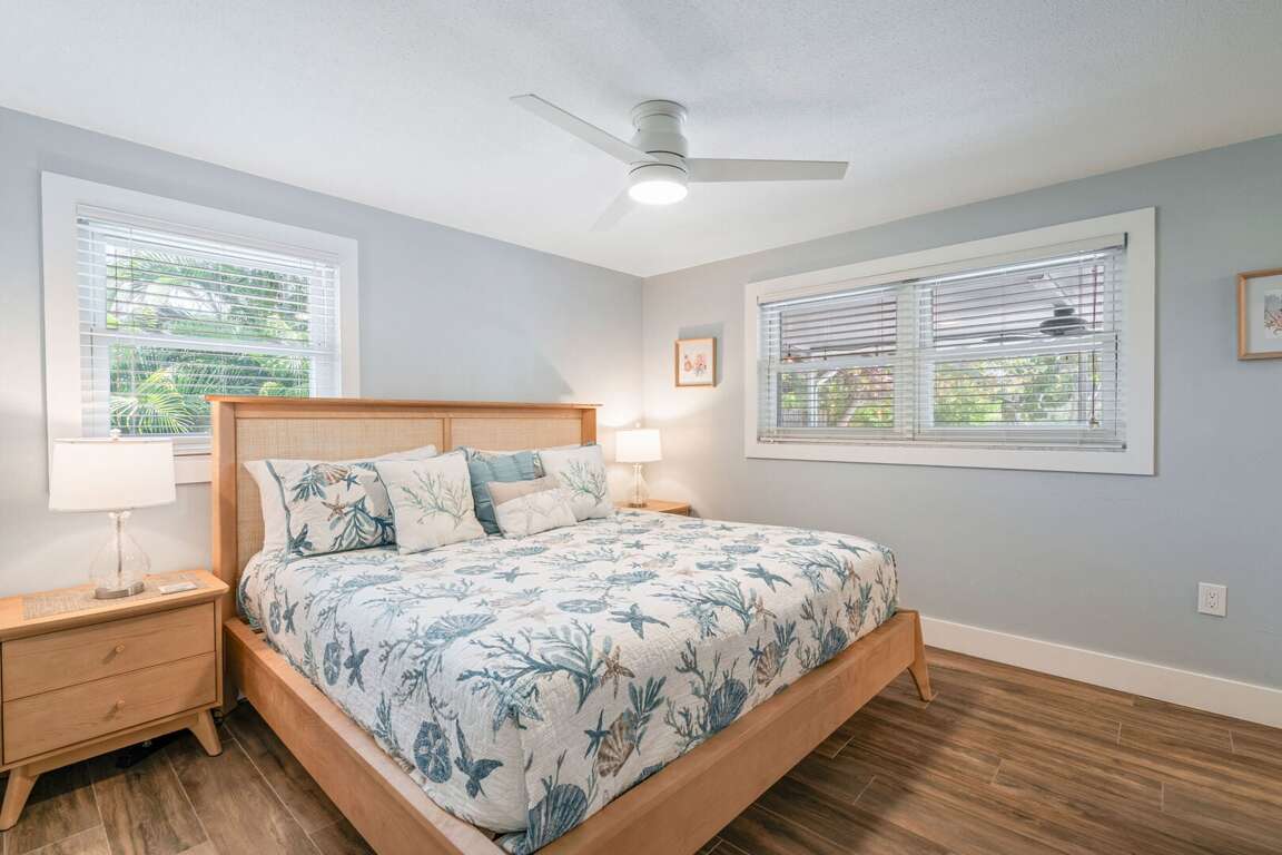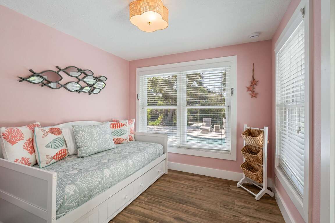 The primary bedroom is a peaceful retreat with a king bed, direct access to the pool, and a private ensuite bathroom with a walk-in shower. The second bedroom also features a king bed and easy access to a hallway bathroom with a walk-in shower. A den off the kitchen includes a twin daybed with a trundle, ideal for children or extra guests. Each space is thoughtfully styled with coastal décor and comfortable linens to ensure a restful stay.