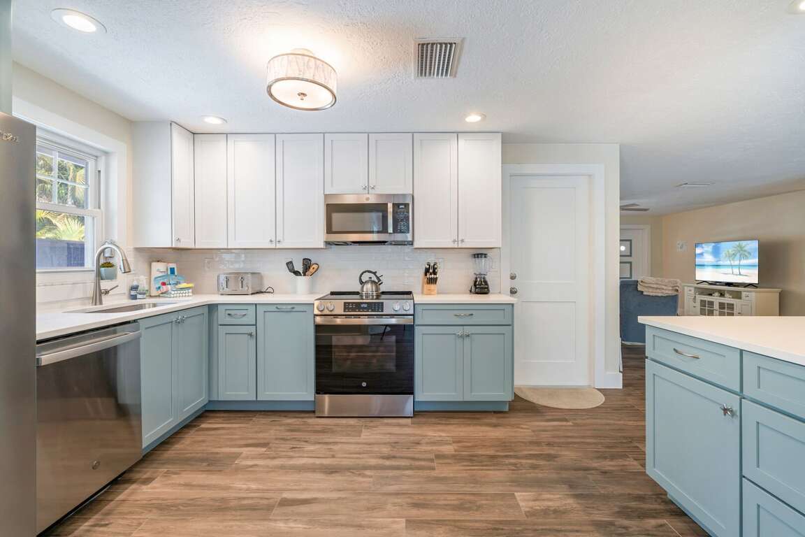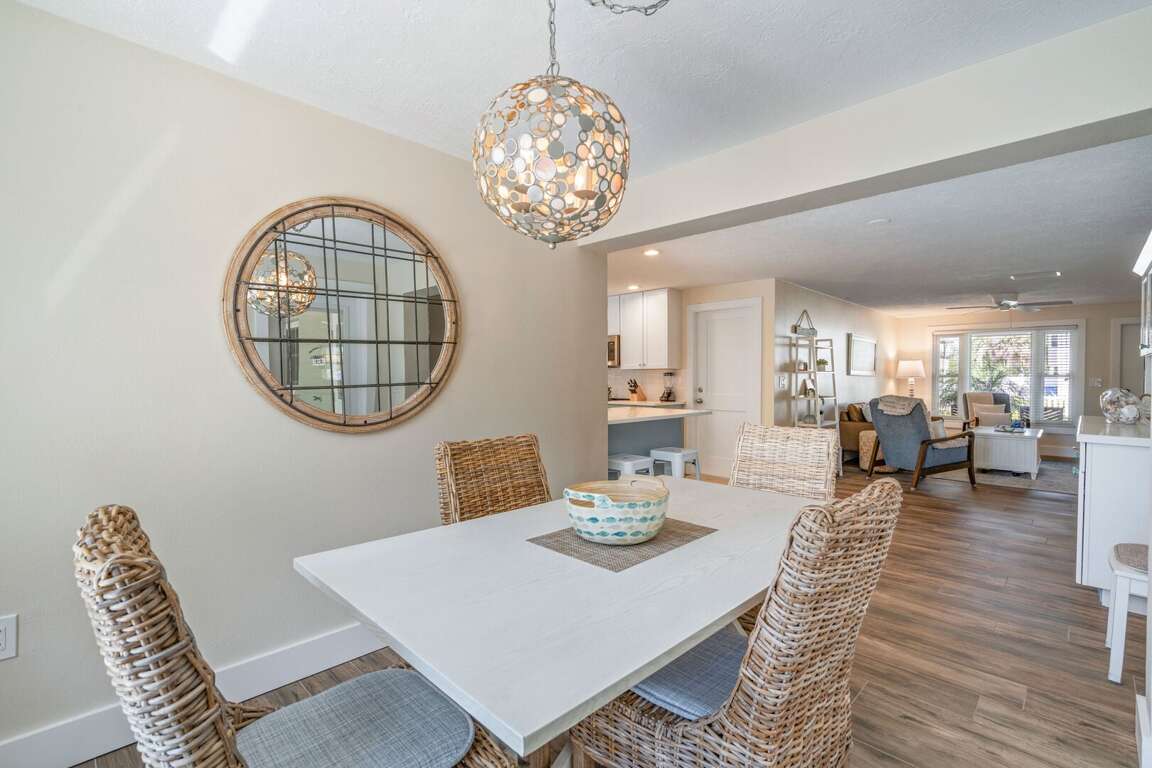 Dockside Paradise, inside, features a bright beach-inspired interior with a modern, open layout. The living area offers comfortable seating and a TV, creating a welcoming space to relax after exploring Anna Maria Island. The fully equipped kitchen includes modern appliances and ample counter space, seamlessly connecting to the dining area and outdoor patio for effortless indoor-outdoor living.