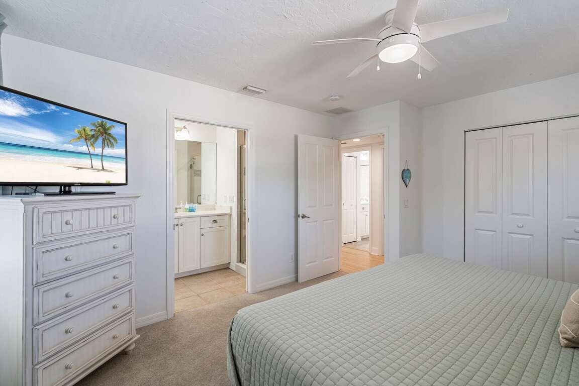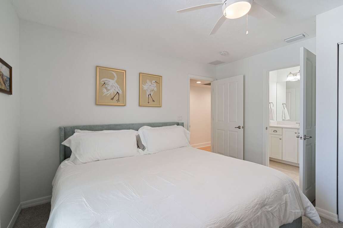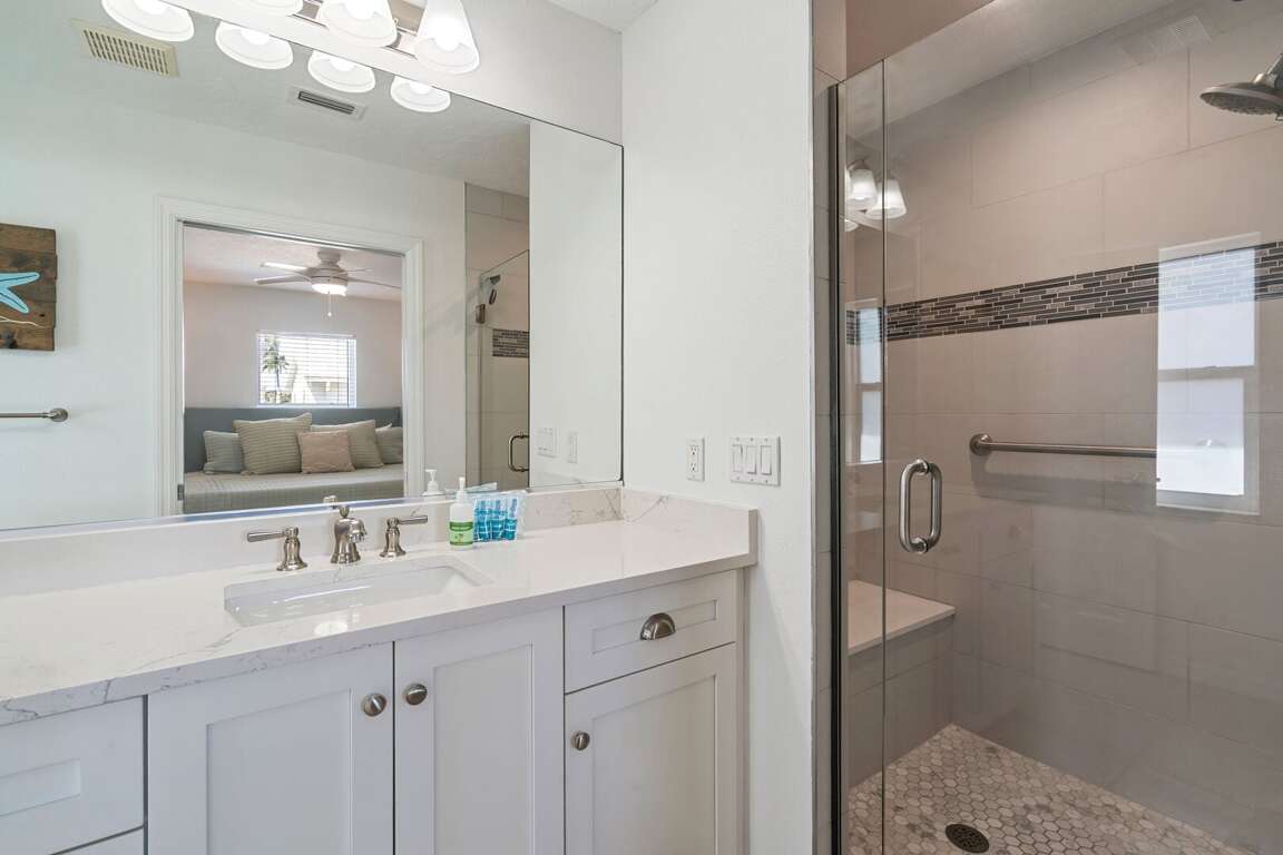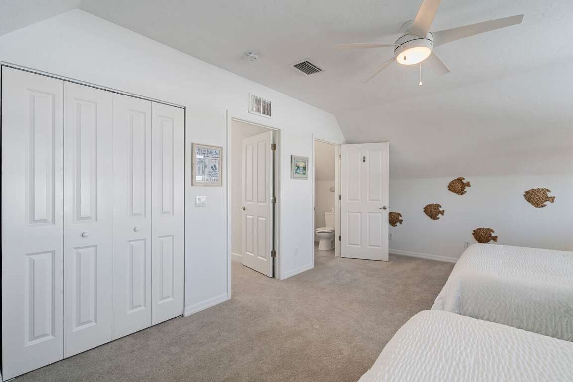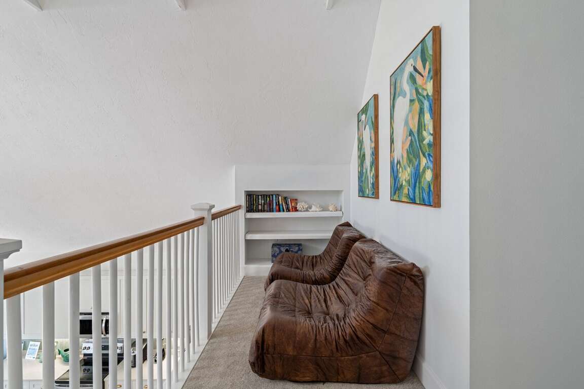 The first floor features two well-appointed bedrooms. The primary suite includes a king bed and a private ensuite bathroom with a walk-in shower. A second bedroom also offers a king bed and is located just steps from a hallway bathroom. Upstairs, a cozy loft with reading chairs provides a quiet space to unwind. The third bedroom is ideal for families or groups, featuring two queen beds over twin bunks and an adjoining bathroom with a tub/shower combination.