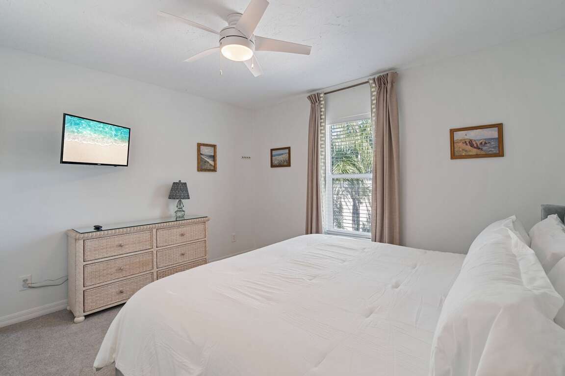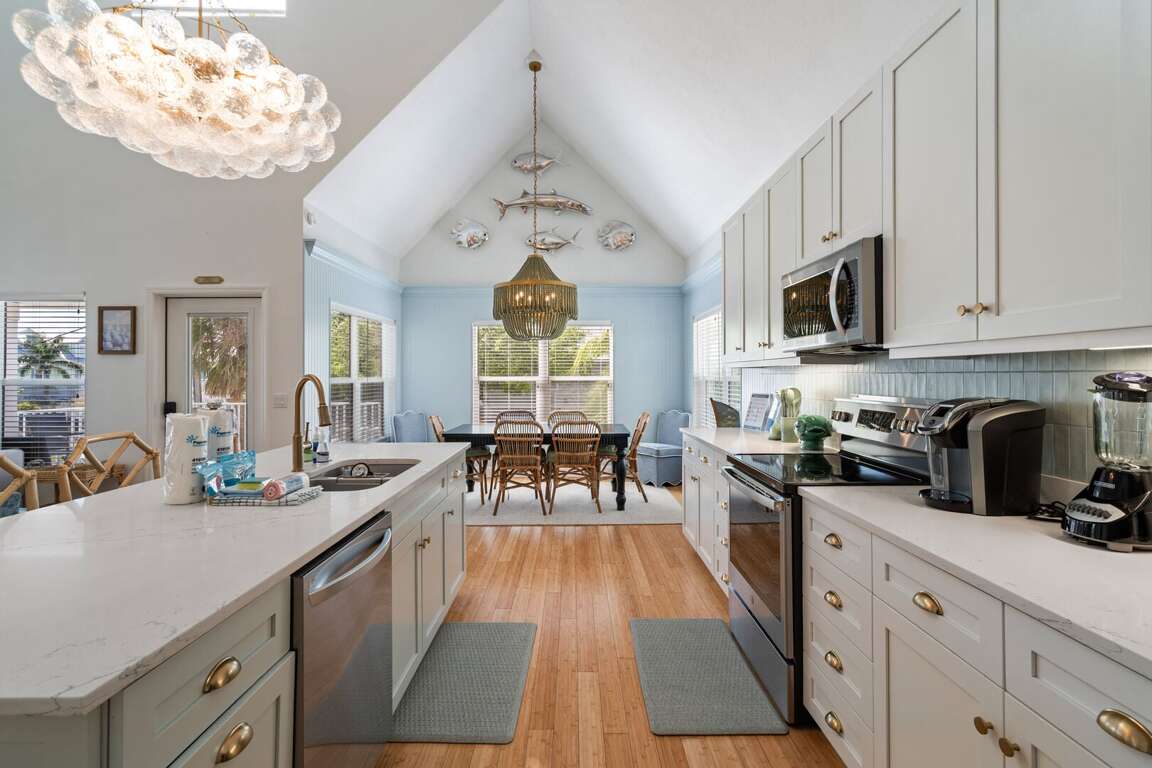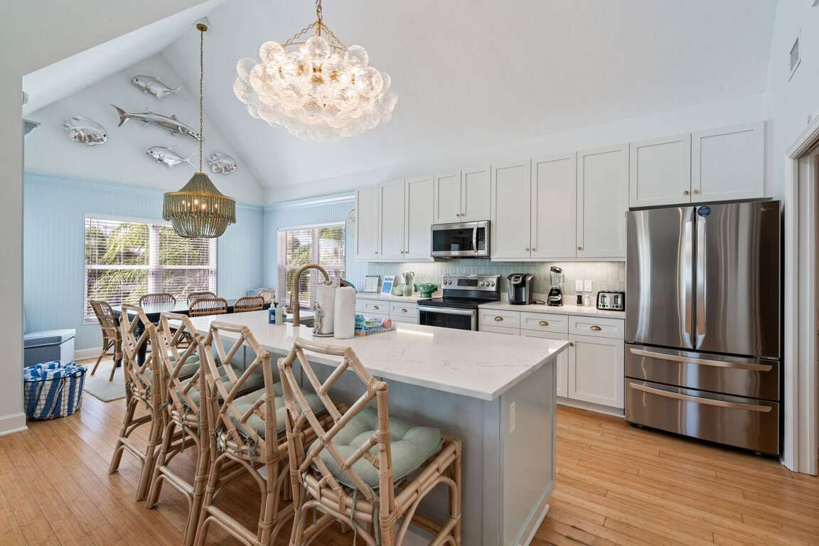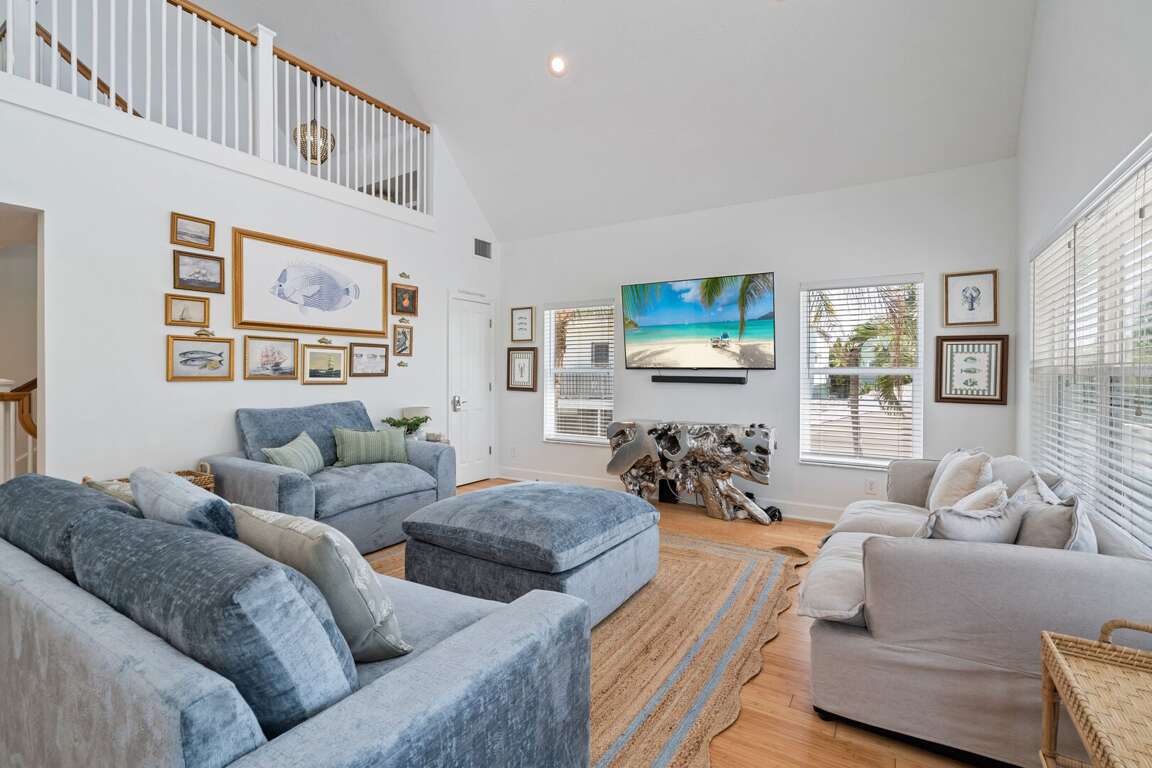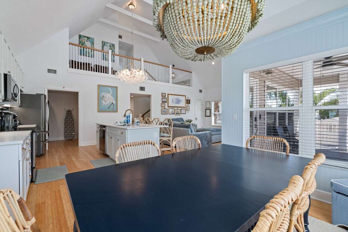 Inside, high ceilings and abundant natural light create an open, welcoming atmosphere throughout the home. The living room offers plentiful seating, including a queen sleeper sofa, providing additional comfortable sleeping space when needed. The large kitchen flows seamlessly into a generous dining area, making it easy to gather for meals, conversation, and time together. A convenient laundry room adds extra comfort for longer stays.