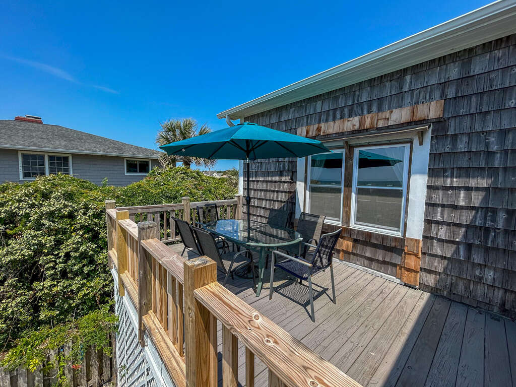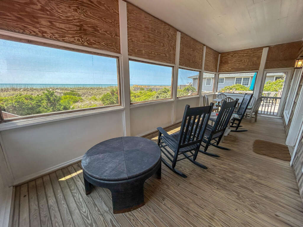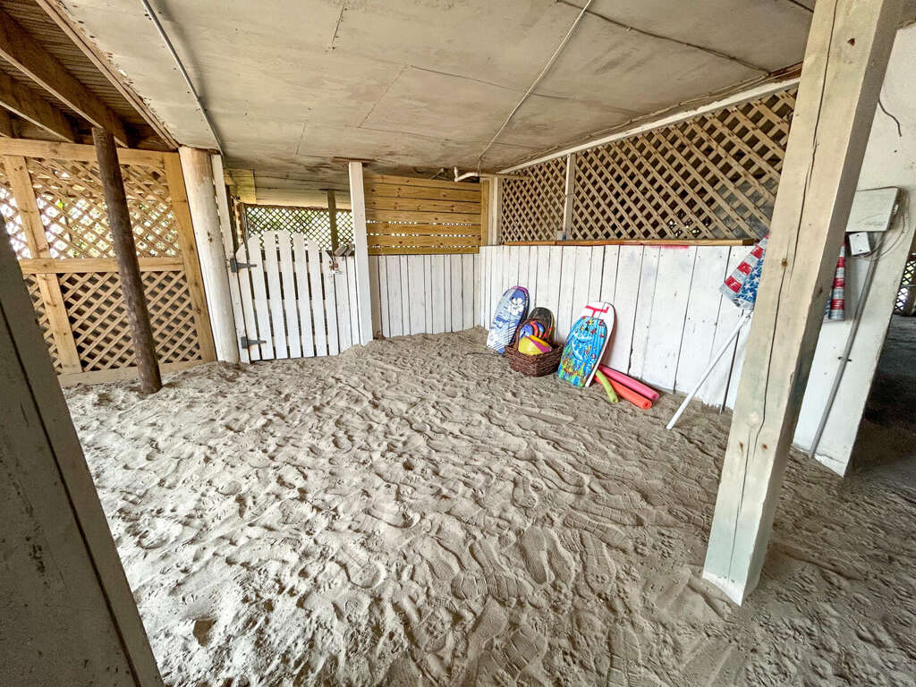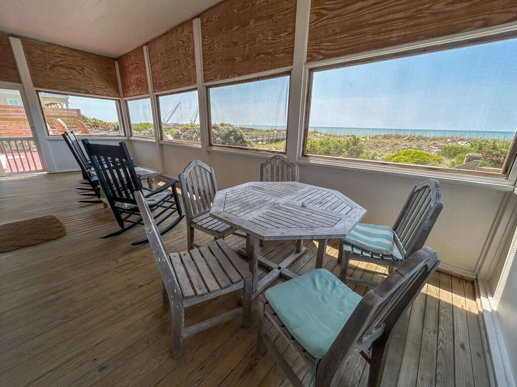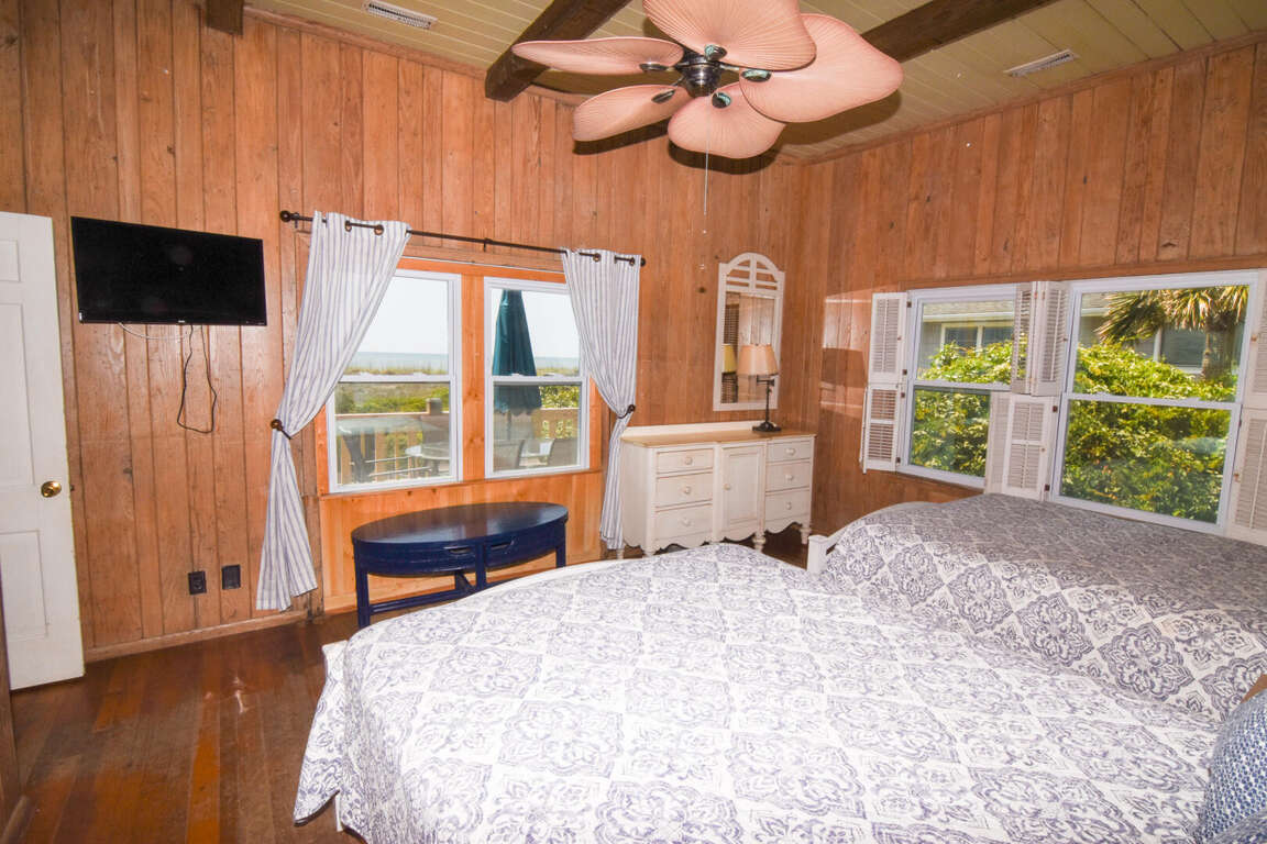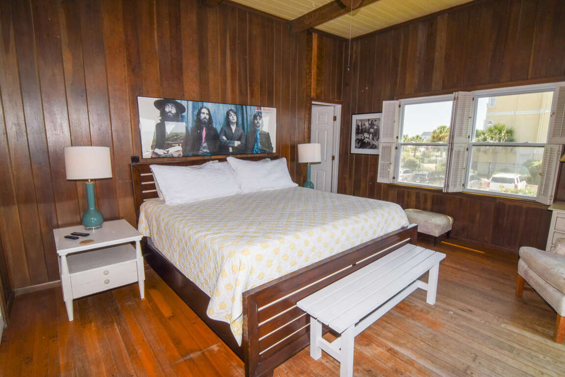 North Myrtle Beach oceanfront vacation rental home with private pool, high exposed beams and large open family room. This is a six bedroom, six full bath home with two of the bedrooms located on ground level (one with a queen and private soaking tub, the other with 3 queens). The two full baths have a walk-in shower. These downstairs bedrooms cannot be accessed from the main house entrance Each downstairs bedroom has its own private entrance from the outside. The other four bedrooms are upstairs in the main part of the home, each with a private full bath. The upstairs has a bedroom with a king and twin; a bedroom with a king, a bedroom with 2 queens, and the last with a queen bed.