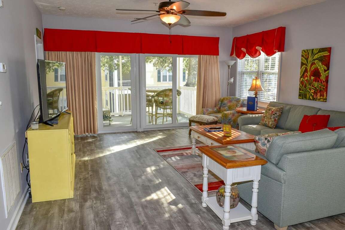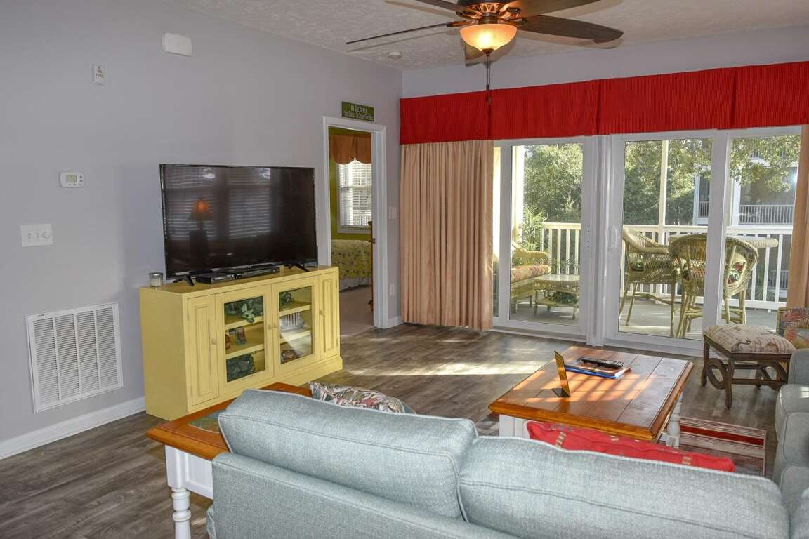Ocean Drive. 3 bedroom, 2 bath condo in gated community. Walking distance to the beach. Sleeps 8. 3rd floor. Elevator. 3 queen beds, 1 queen sleeper sofa. 4 TVs. Screened porch with view of pool. 2 parking spaces. Outdoor pool, hot tub, fitness center, tennis court, kiddie pool, grilling and picnic area. No smoking. No pets. No motorcycles. Families only. No student groups. GOLF CART RENTAL IS ALLOWED.