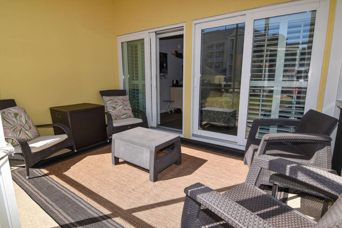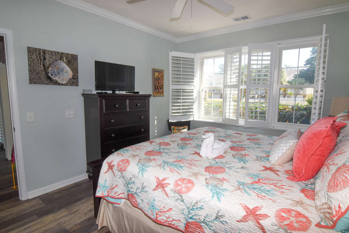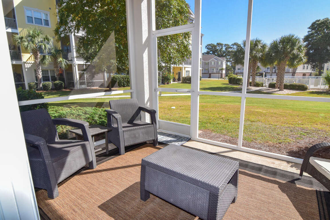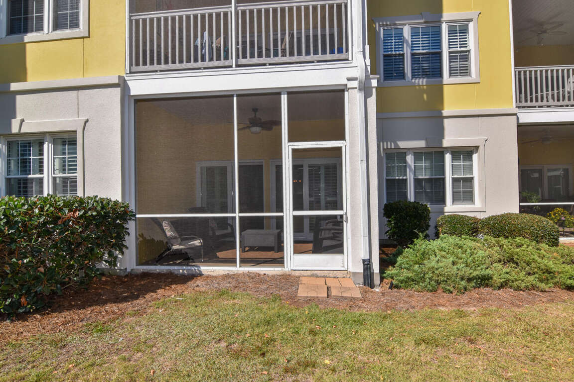 Ocean Drive. 2 bedroom, 2 bath condo in gated community. 1st floor. Walking distance to beach. Sleeps 4. King bed, queen bed. Screened porch. View of pool and entertainment area. Outdoor pools, hot tubs, fitness room, tennis courts. 2 parking spaces provided. No pets. No smoking. No motorcycles. Families only. No student groups. Golf cart rental allowed.