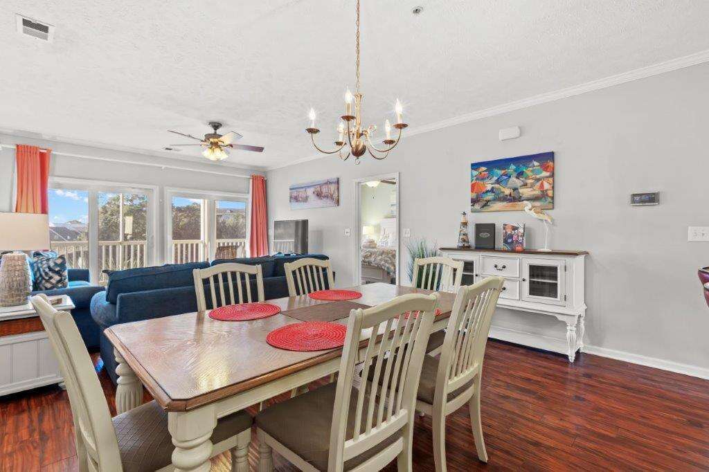 Ocean Drive. 3 bedroom, 2 bath condo in gated community. Elevator (4 stairs to elevator). 2nd floor with view of the lake. Walking distance to the beach. Sleeps 8. King, queen, 2 doubles. Screened porch. 2 parking spaces provided. Golf cart rental allowed. No pets. No smoking. No motorcycles. Families only. No student groups.