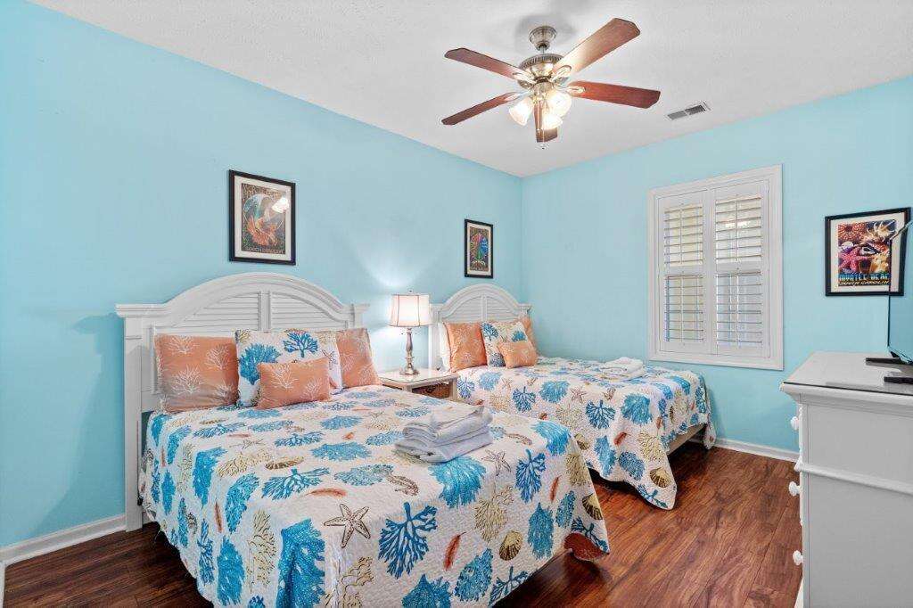 Ocean Keyes 2323 is a beautifully decorated 3 bedroom, 2 bath condo located on the 2nd floor with an elevator (4 stairs to elevator) and a view of the lake. This non-smoking condo sleeps 8. It has a master bedroom with a king bed and TV. The master bath has a tub and shower combination. The second bedroom has 2 double beds and a TV. The third bedroom has a queen bed and a TV. The second bath has a new walk-in shower. Off of the living area is a screened porch with a view of the lake. This condo is equipped with a dining area, a fully equipped kitchen, washer/dryer, and free Wifi. This condo also has garage parking for vehicles. A golf cart is allowed with designated parking on the lot provided.
