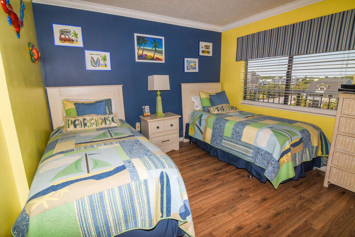 - Second bedroom: Ideal for children or additional guests, this room offers two twin beds with inviting bedding. The vibrant colors and playful accents make it a cheerful and inviting space.
