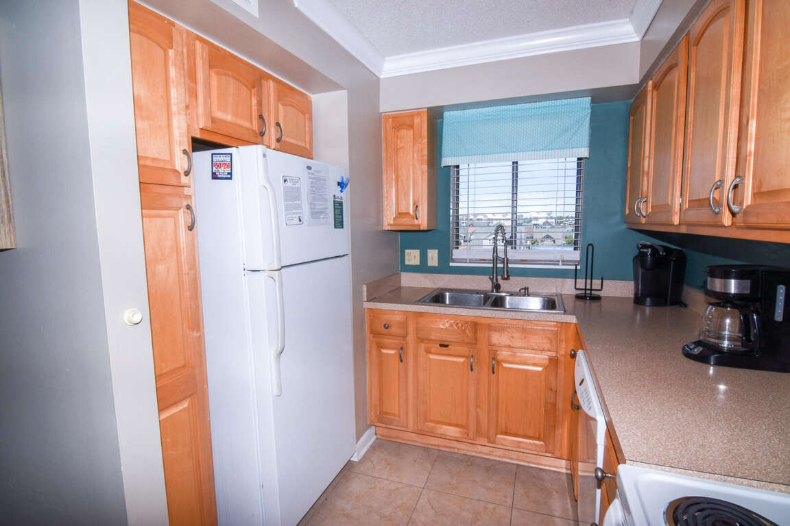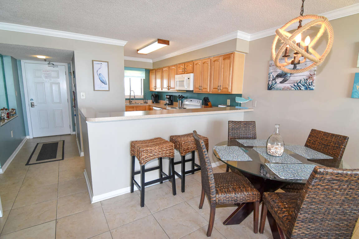 Located in the heart of the Sea Winds building, the living area and kitchen of Sea Winds 408 offer a comfortable and well-appointed space for relaxation and culinary endeavors during your North Myrtle Beach vacation. The nicely decorated living area provides a cozy atmosphere where you can unwind and enjoy your favorite shows on the TV. Step out onto the large oceanfront balcony and take in the breathtaking views of the beach and ocean. The fully stocked kitchen is equipped with all the appliances, pots, pans, and utensils you need to prepare delicious meals. Gather around the dining table for 4 or pull up a bar stool at the bar for casual dining. With no carpet in the unit, you can enjoy freedom and ease of cleaning.