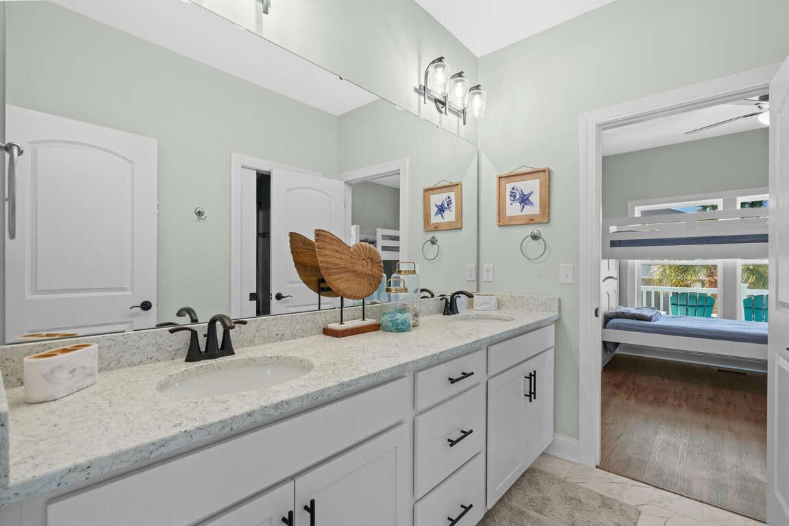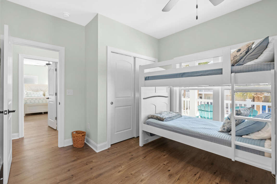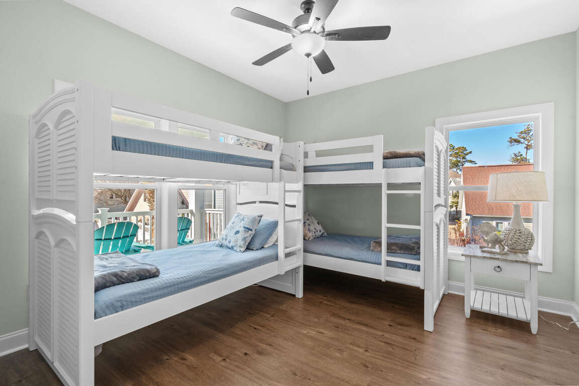 The North Myrtle Beach vacation rental offers a well-designed and spacious bedroom layout, ensuring comfort and privacy for all guests. The property features four bedrooms, each designed with a unique style and equipped with modern amenities. On the second floor, there is a queen bedroom with a TV and balcony access, perfect for enjoying the coastal breeze. Another bedroom on the same floor features two twin bunk beds and a TV, providing a fun and cozy space for kids or young adults. The master suite on the second floor boasts a king bed, balcony access, and a TV, offering a luxurious retreat for relaxation. On the third floor, there is another master suite with a king bed and a TV. With additional sleeping options such as twin cots and a queen blow-up mattress, this rental can comfortably accommodate up to 12 guests. The bedroom décor is tastefully designed, reflecting the coastal charm of the surrounding area. Guests can choose from a variety of bedding options, ensuring a restful night's sleep.